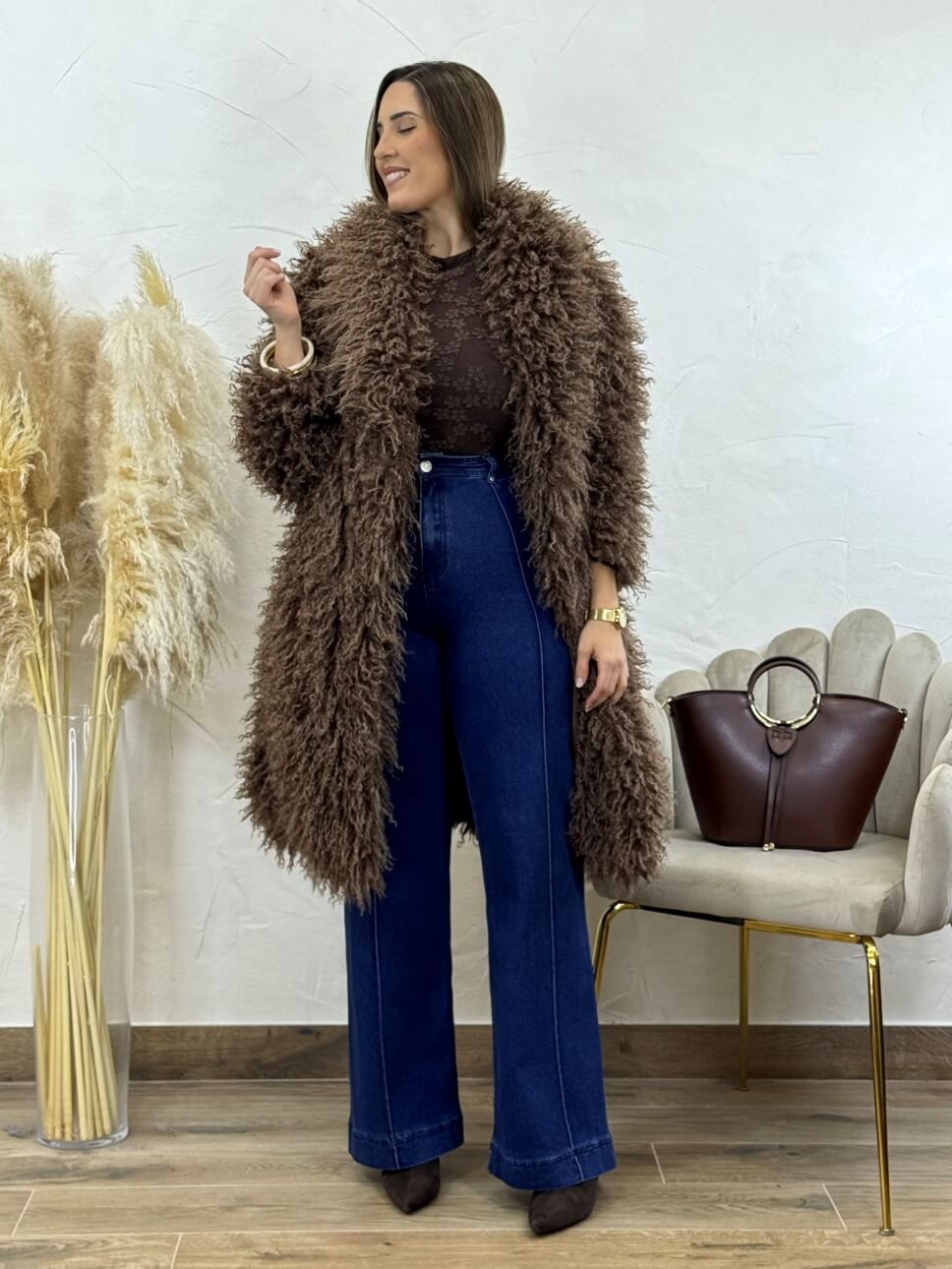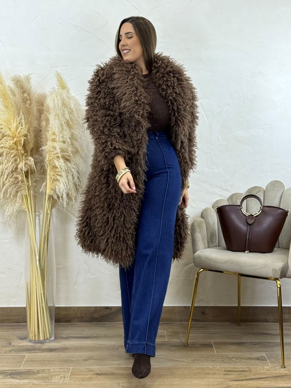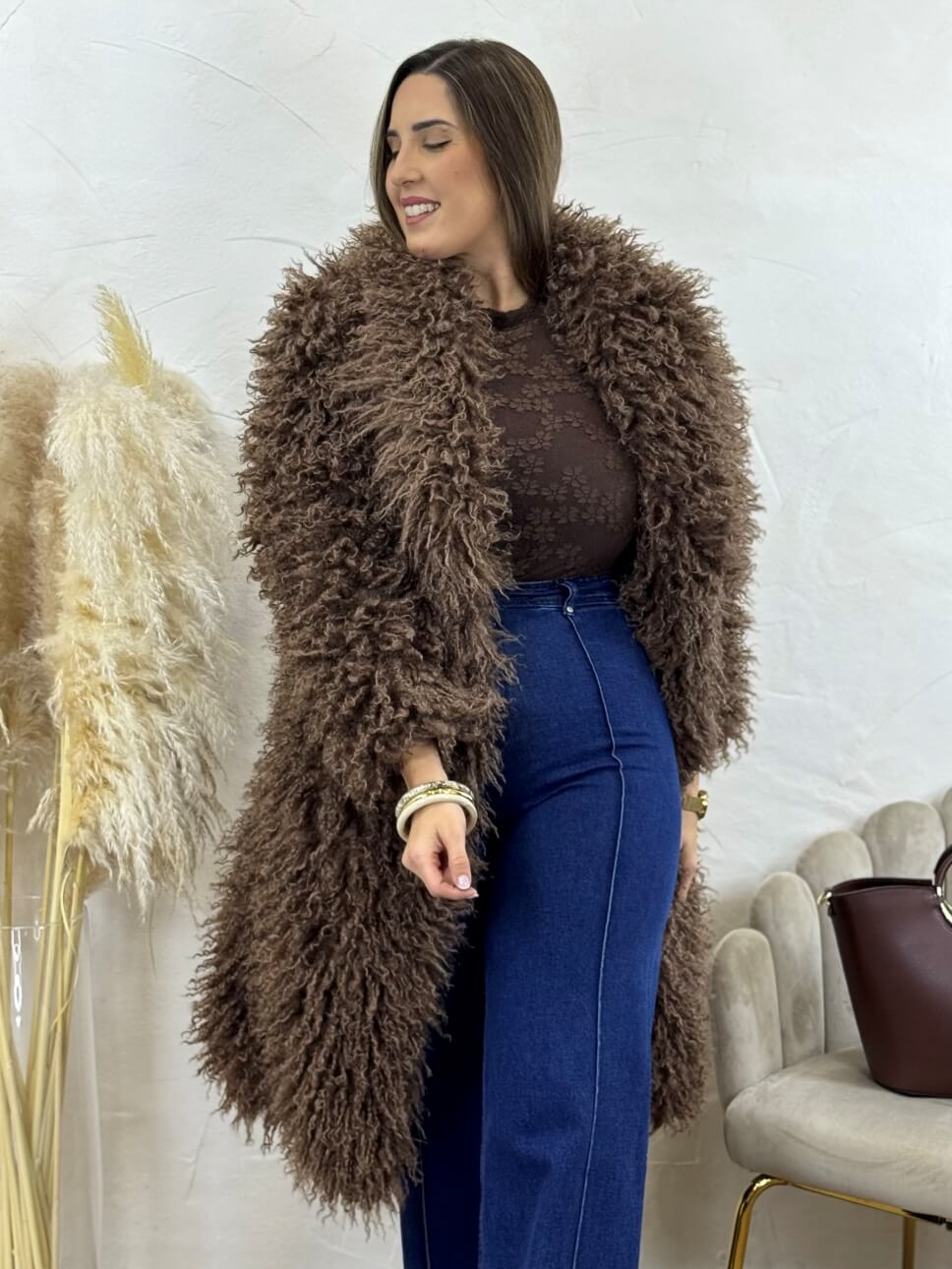 Abrigo de pelo largo con bolsillos laterales y cierre de corchete invisible.