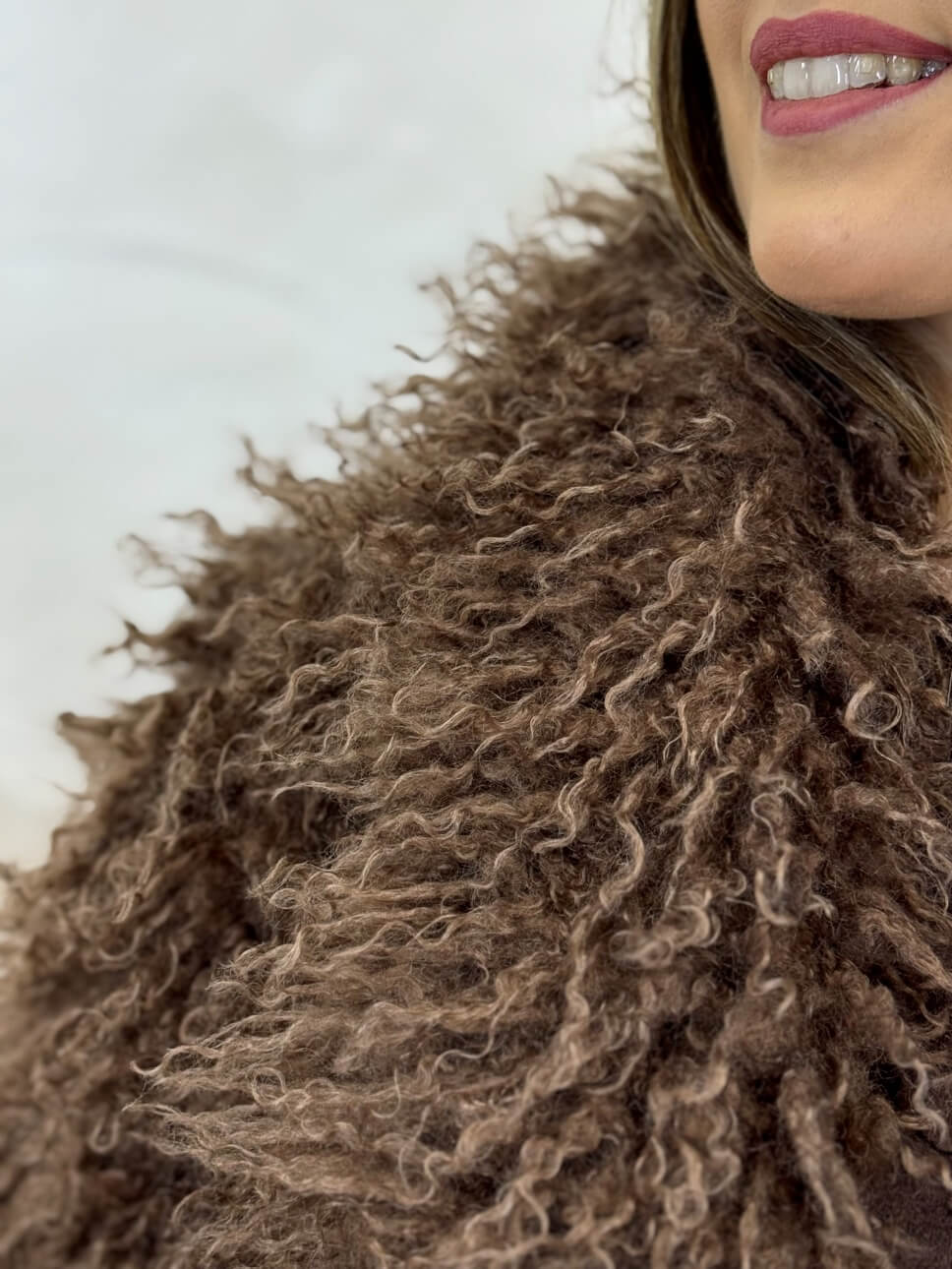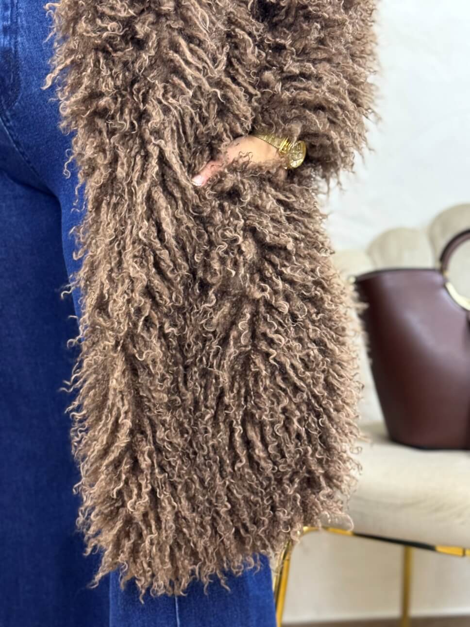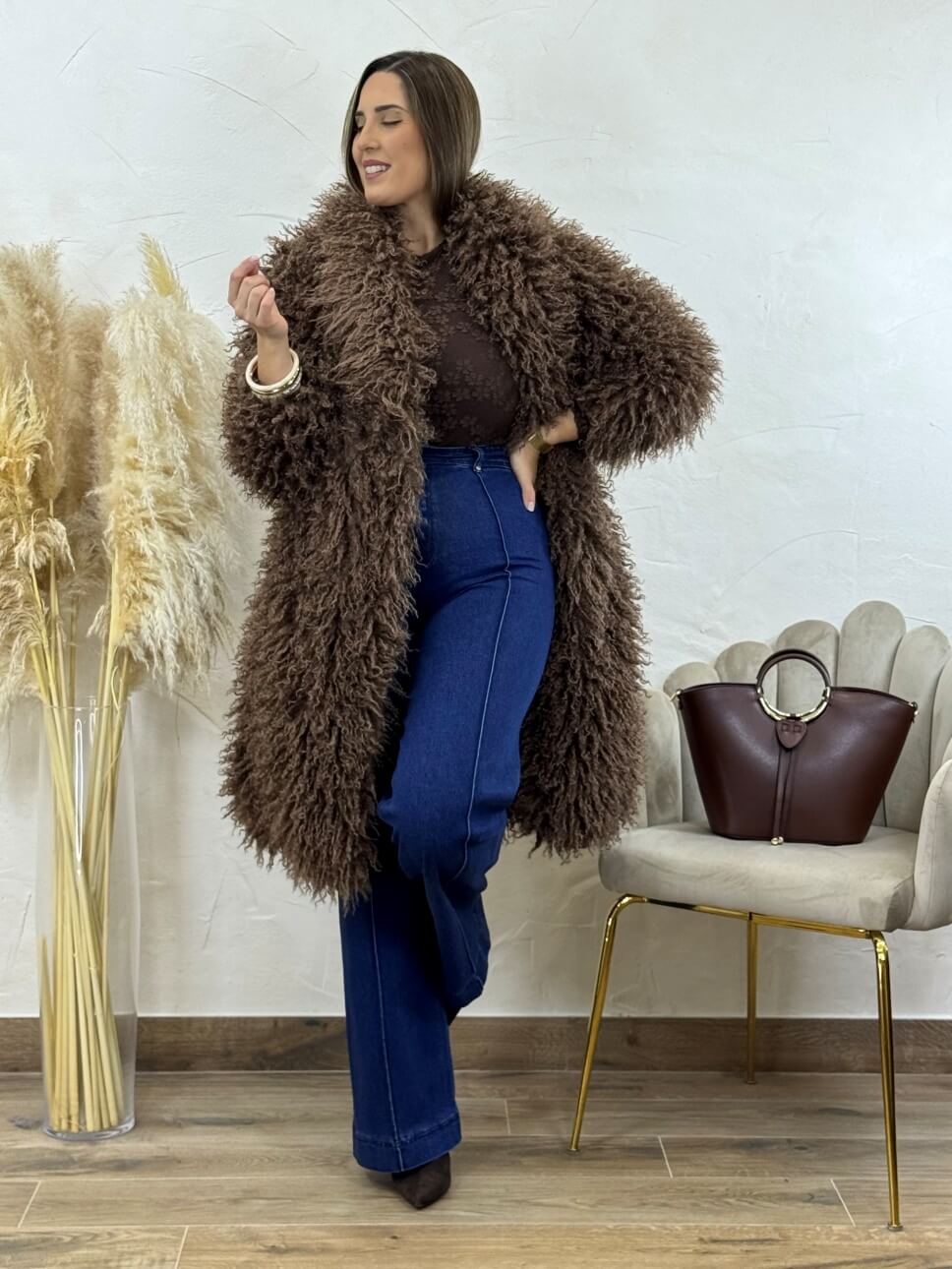 Abrigo de pelo largo con bolsillos laterales y cierre de corchete invisible.