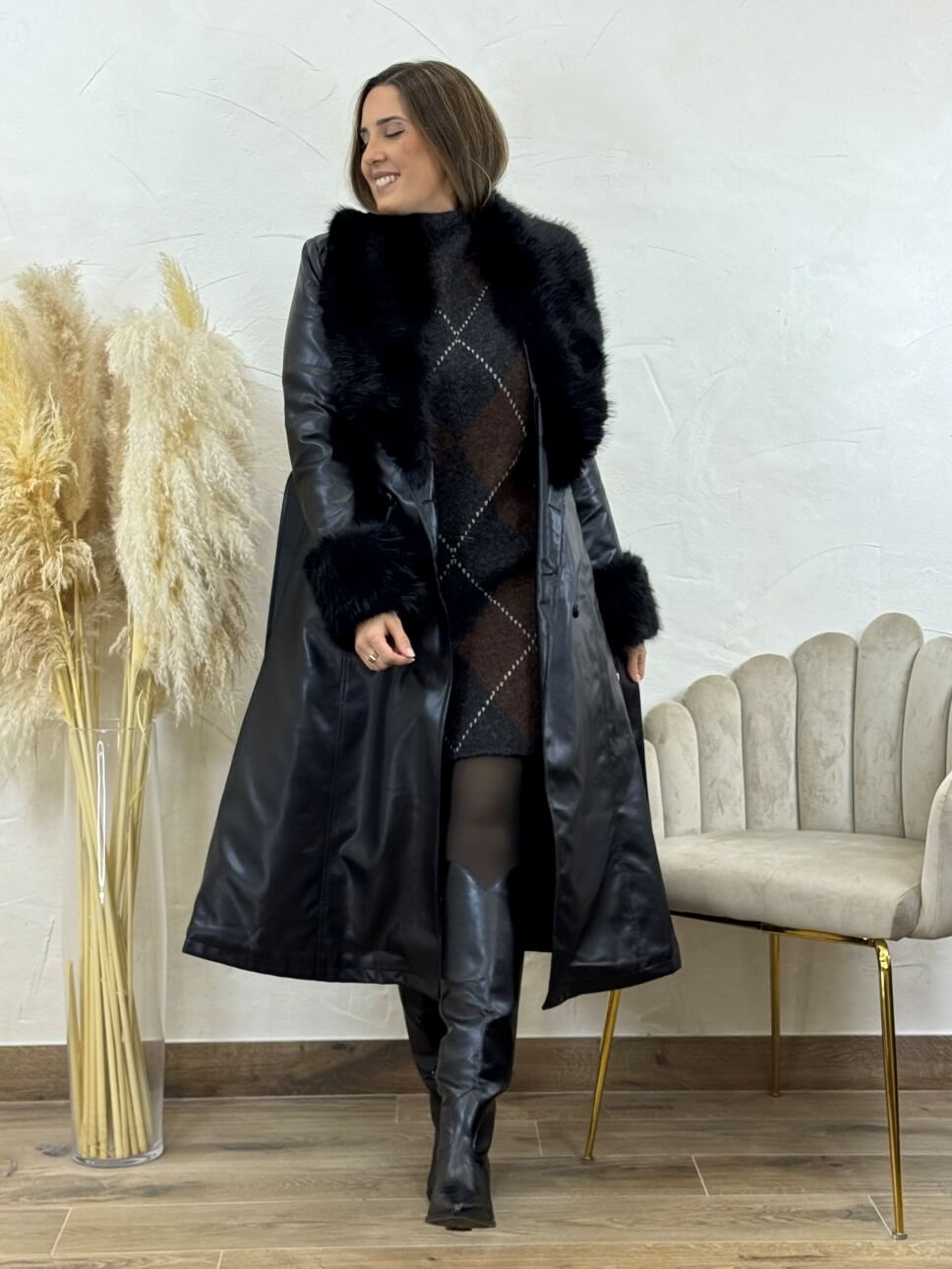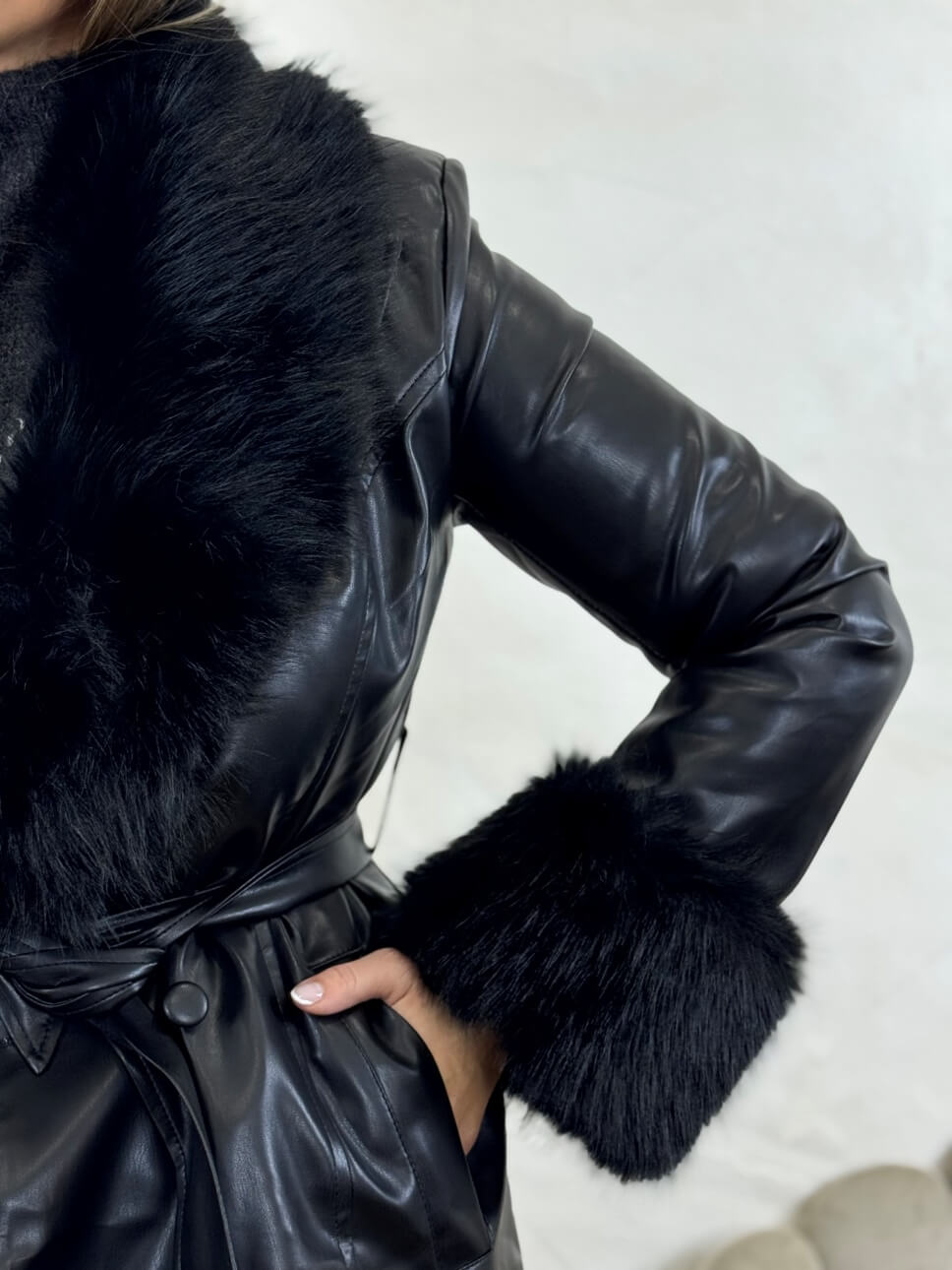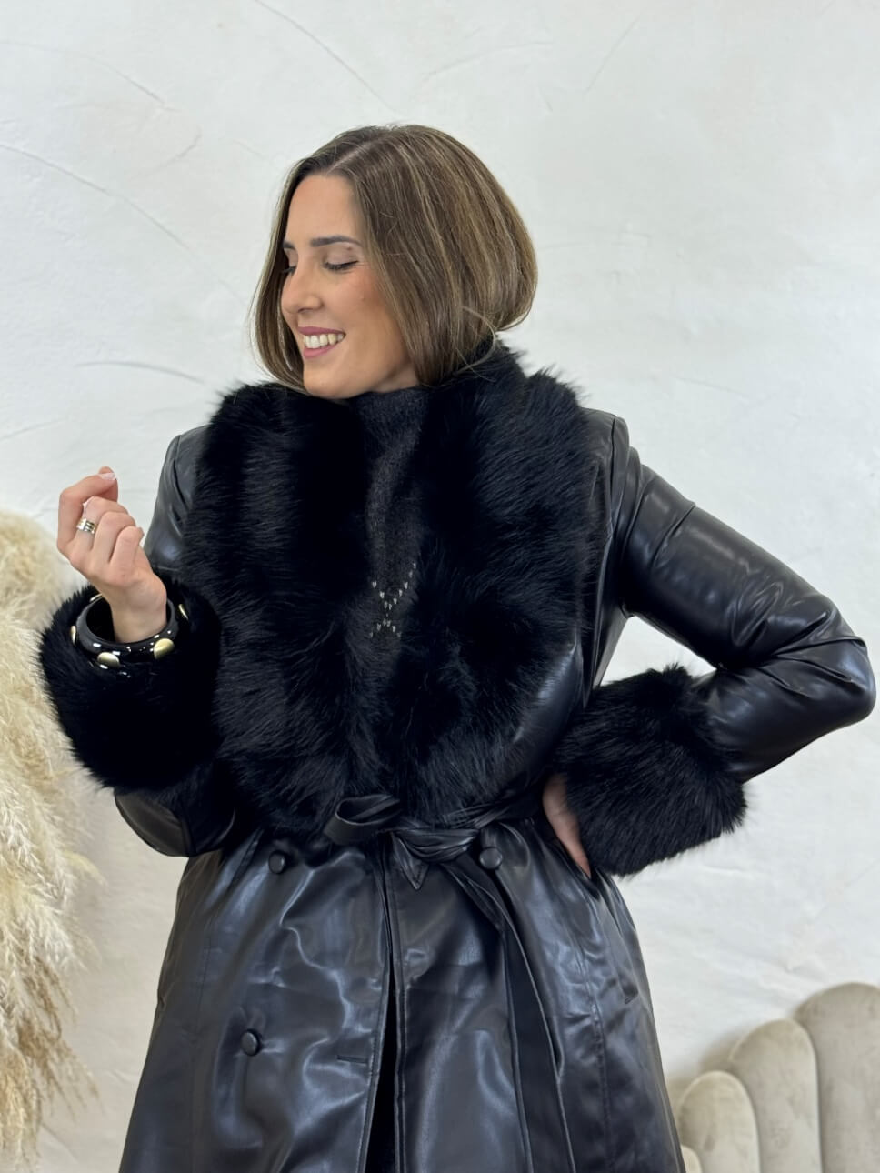 Abrigo largo tejido polipiel combinado con cuellos y puños de pelo sintético desmontables con botones. Cinturón del mismo tejido incluido, cierre abotonado, bolsillos laterales.