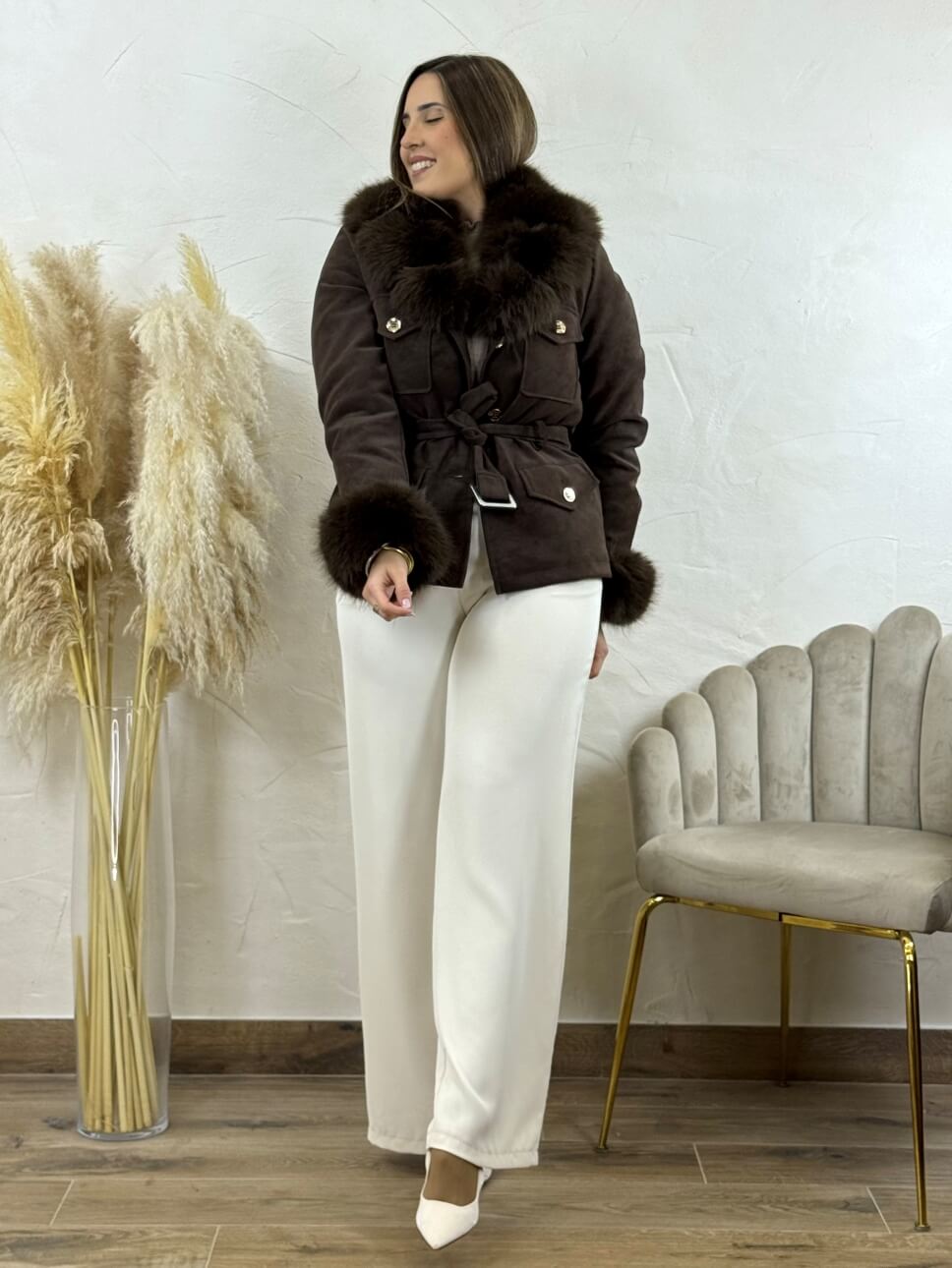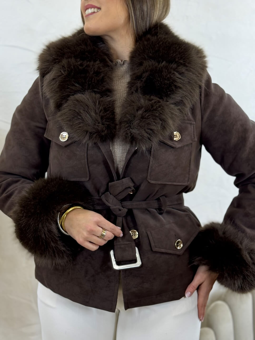 Abrigo efecto piel con cinto del mismo tejido, cierre abotonado, 4 bolsillos frontales con solapa y botón. Pelo sintético en cuello y puños desmontables.