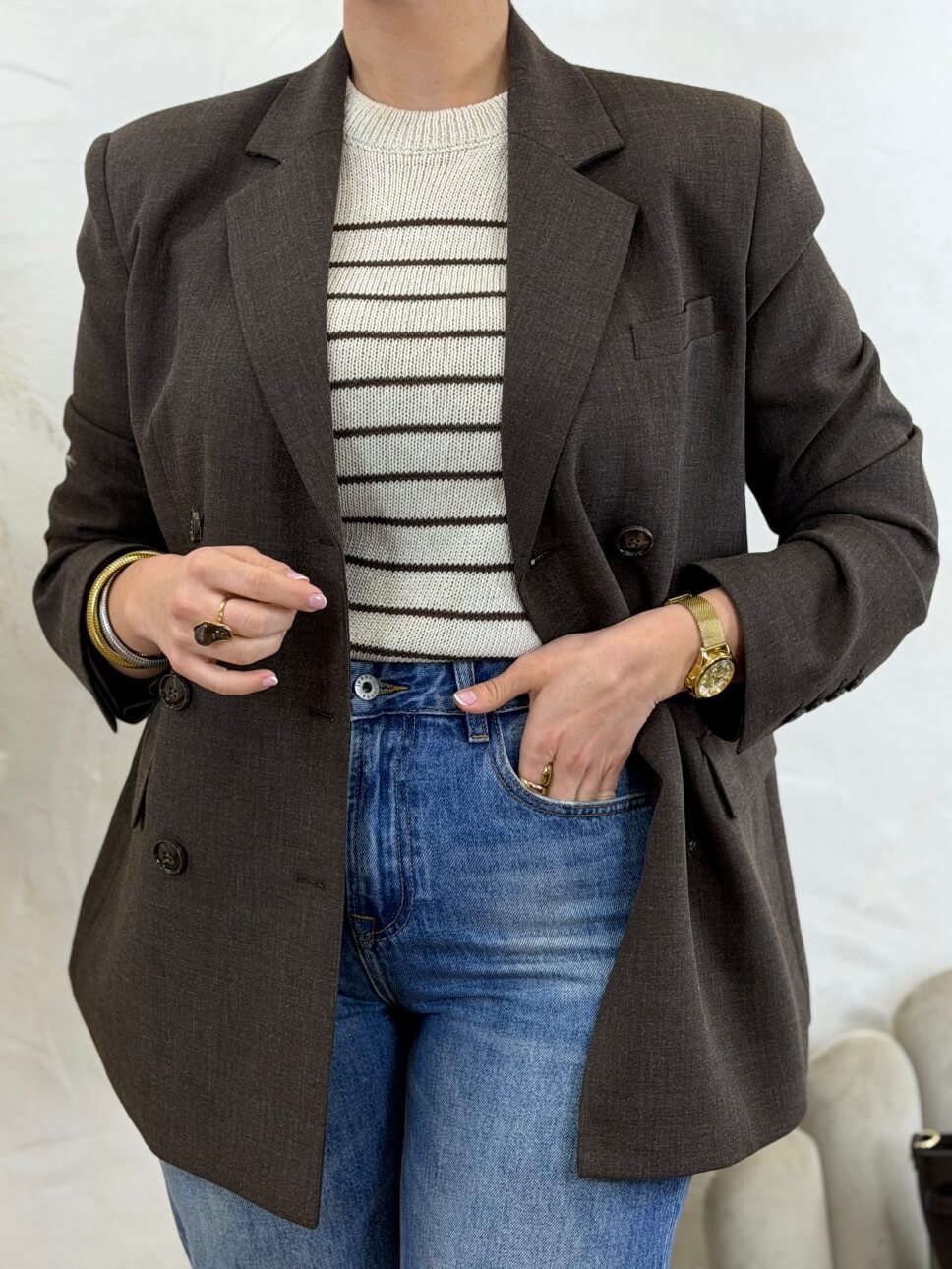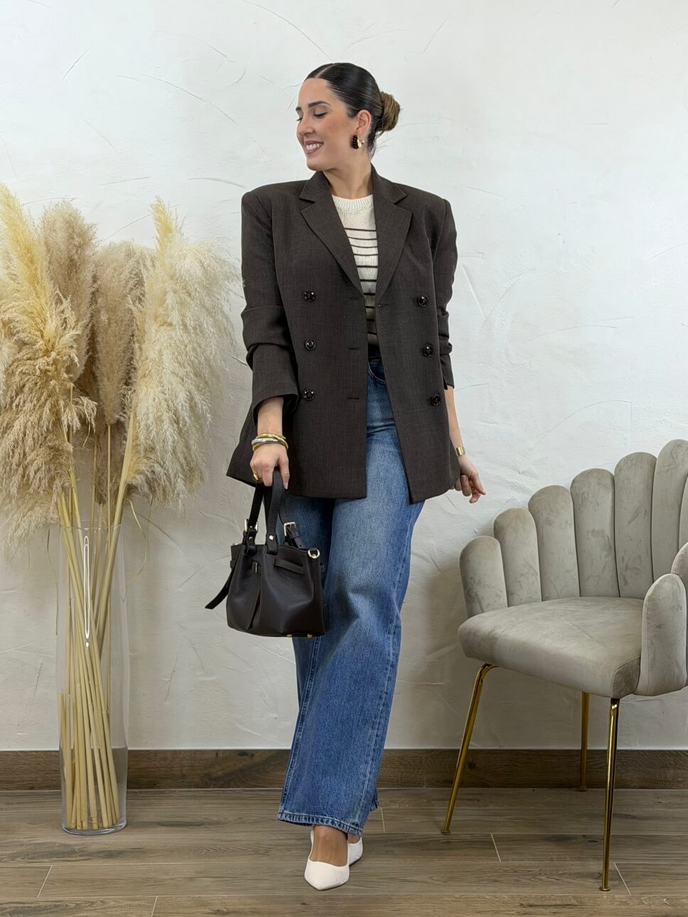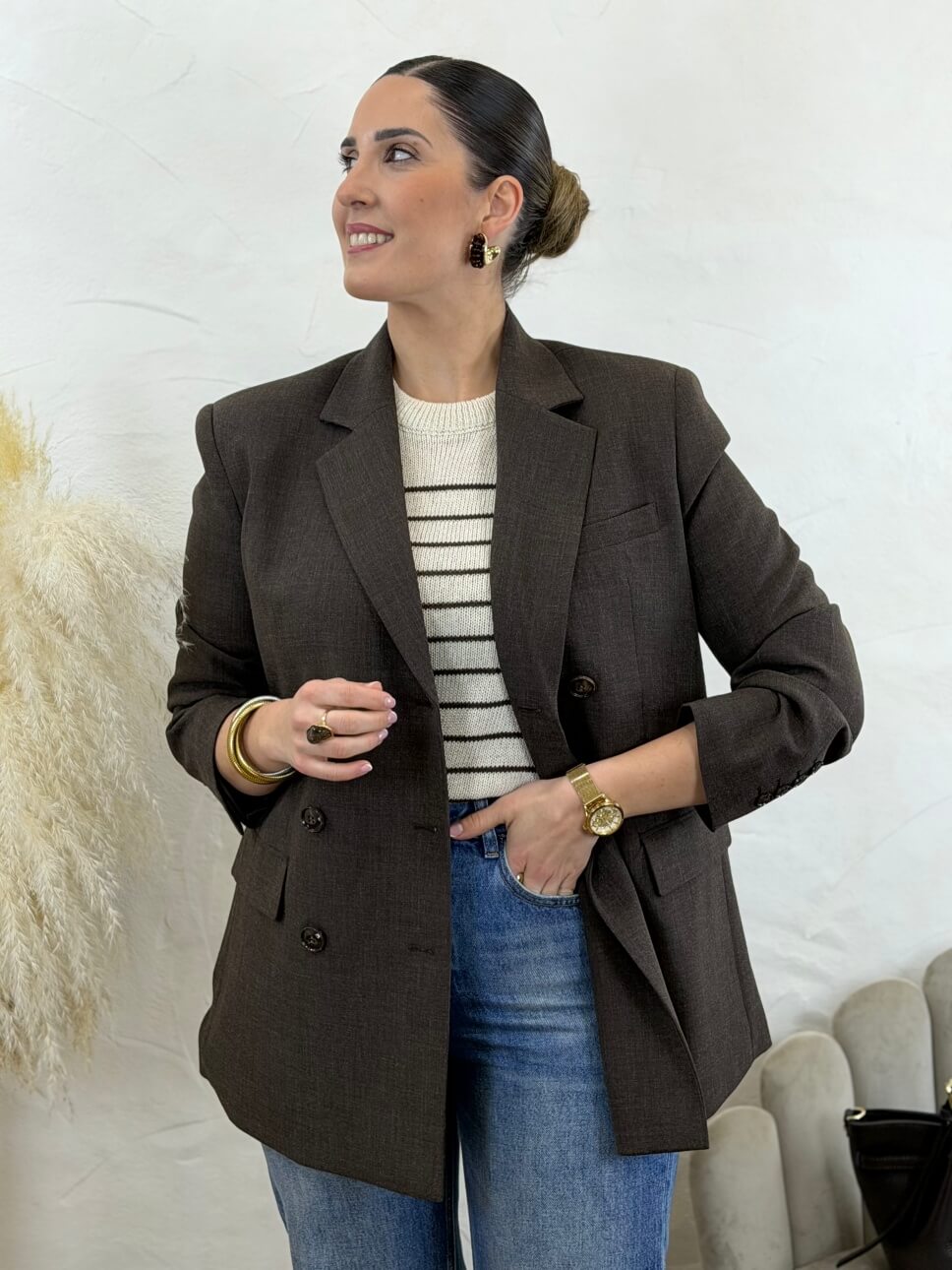 Americana en tejido jaspeado con bolsillos solapados, cierre abotonado, 6 botones, hombreras.