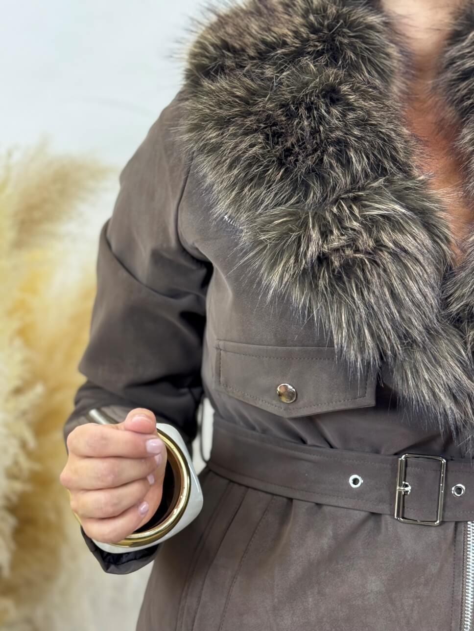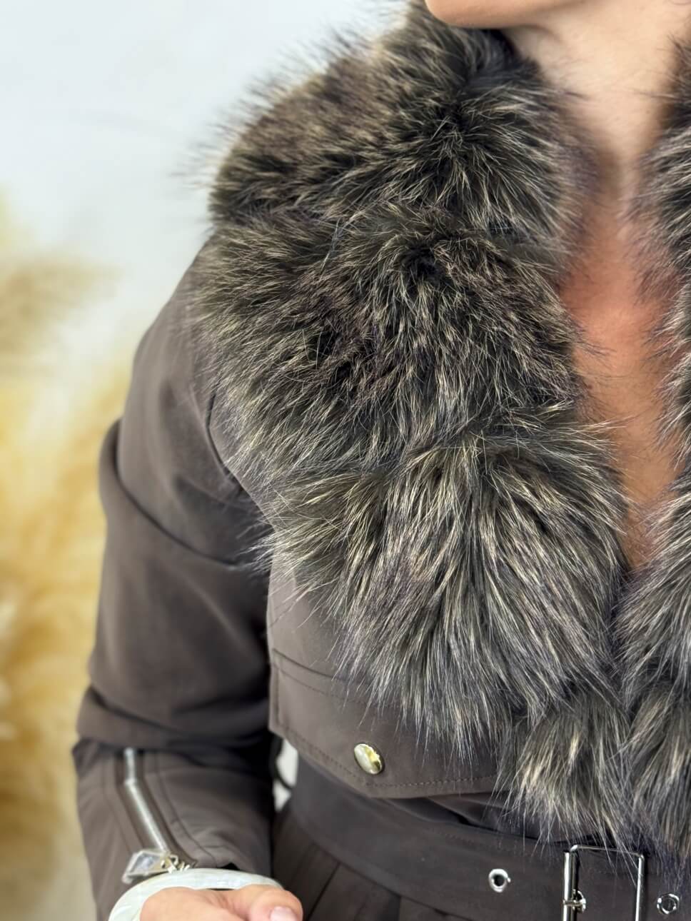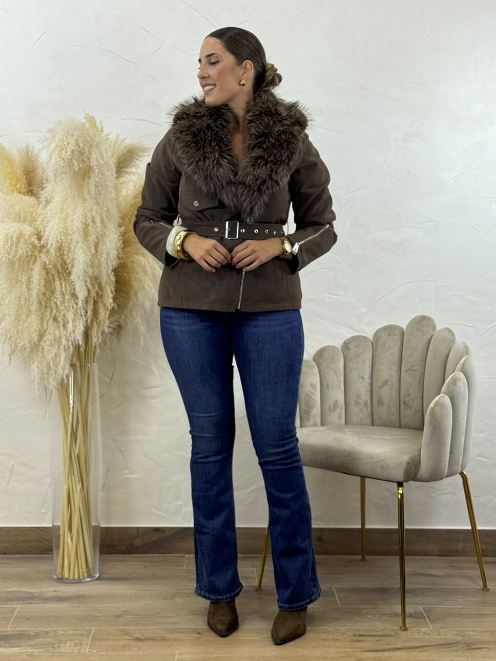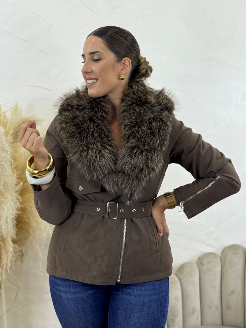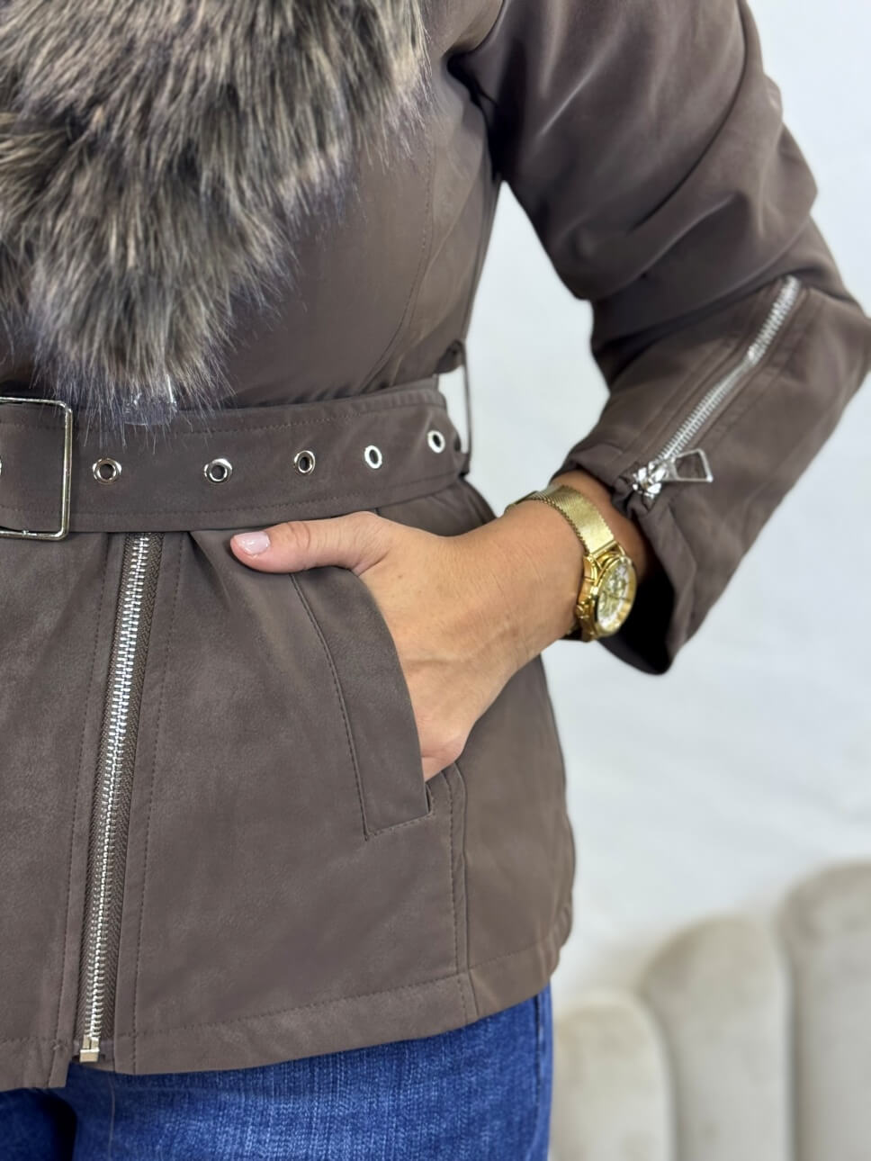 Biker con pelo en el cuello, cierre con cremallera, bolsillos laterales, detalle de solapa con botón en el pecho, cremalleras en los puños, cinturón del mismos tejido.