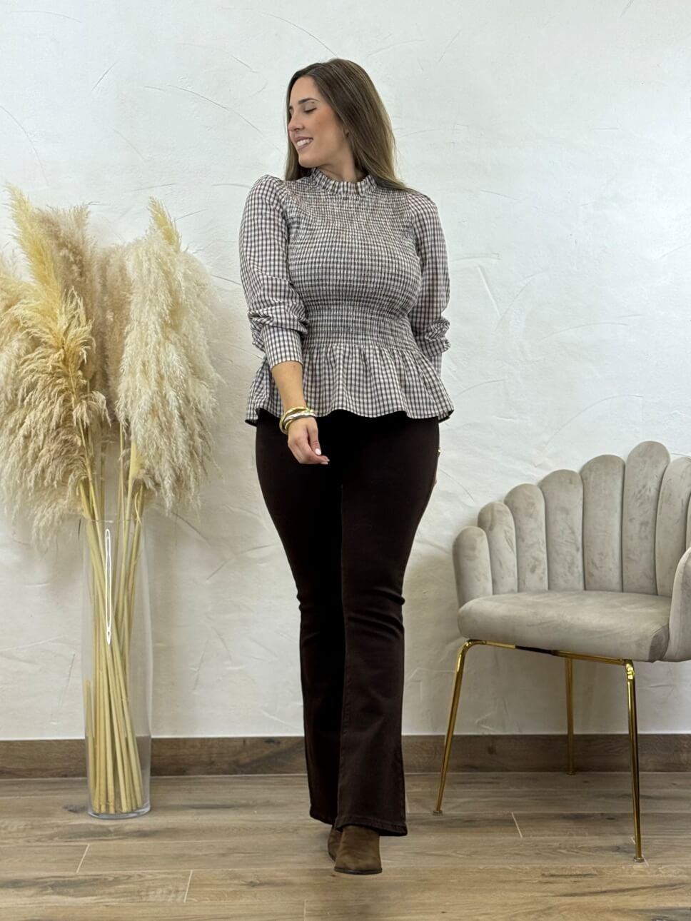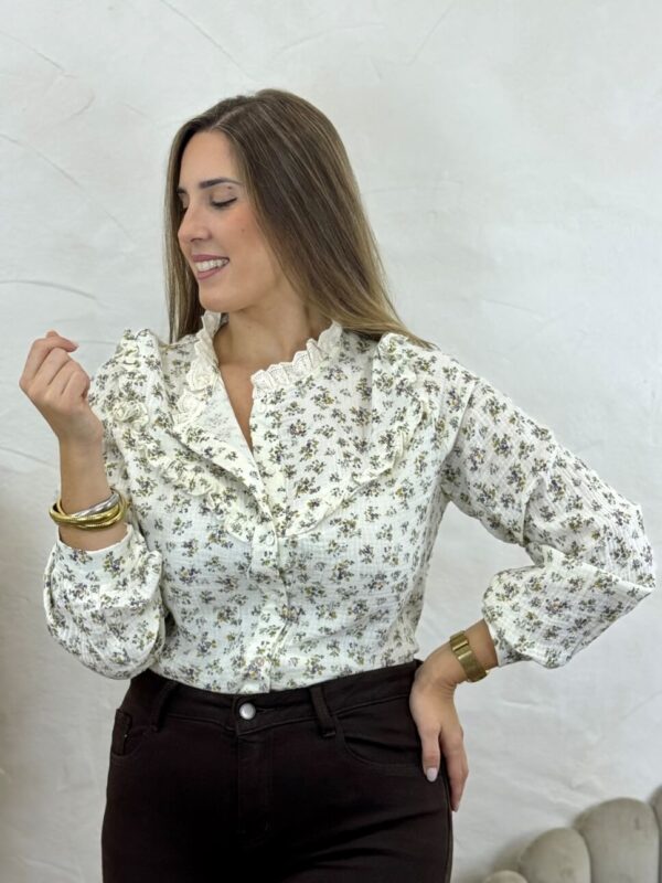 Blusa estampada con manga abullonada, puño y cuello nido de abeja. Cuello mao.