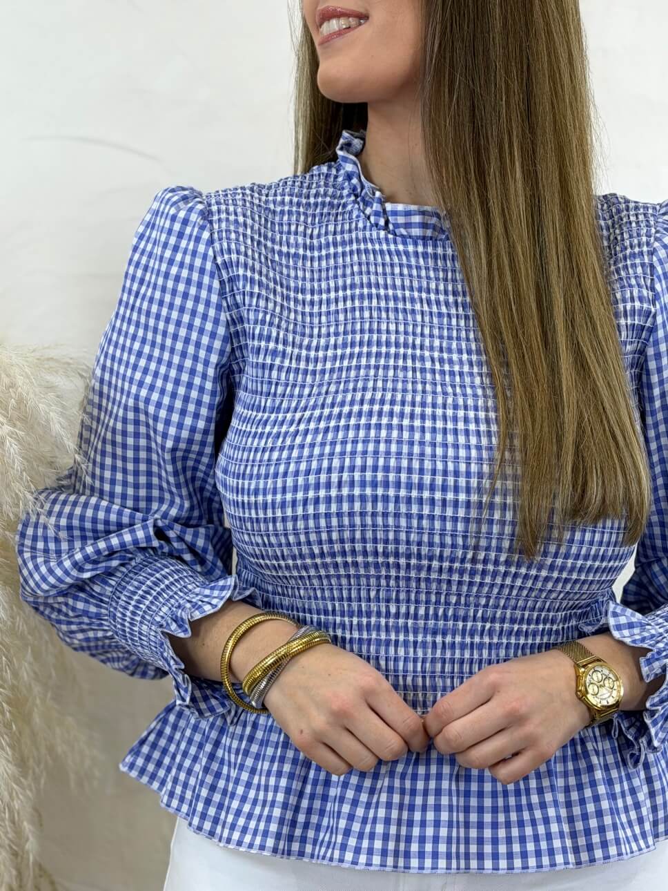 Blusa estampado vichy con cuerpo de nido de abeja, misma estructura en puños con volante y volante en la parte baja, cuello mao.