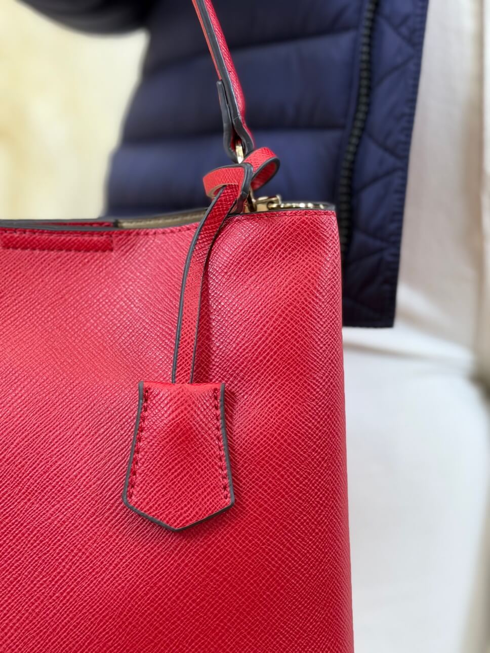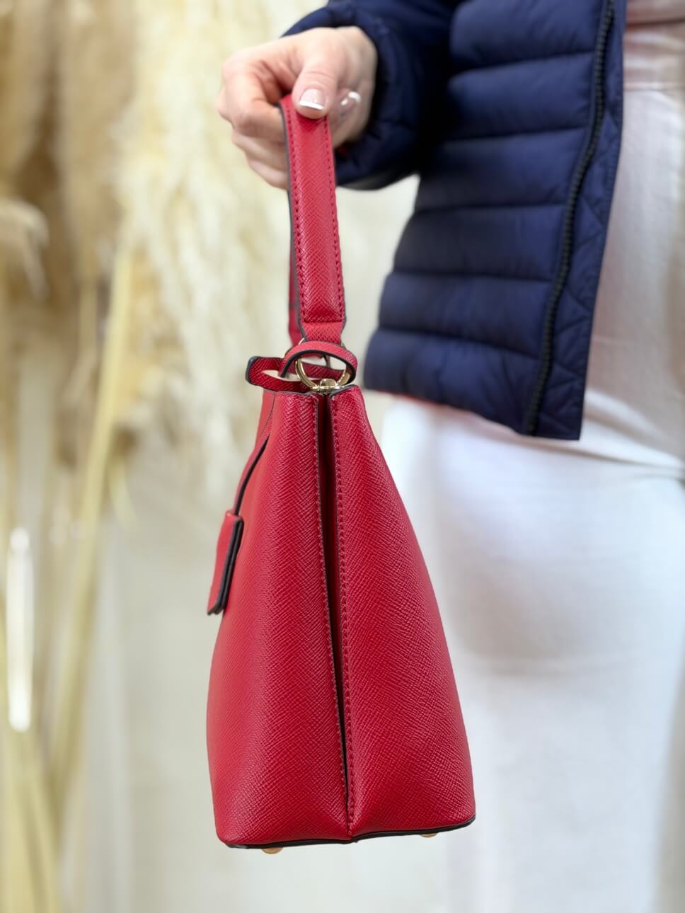 Bolso con cierre de cremallera, asa corta y correa larga incluida.