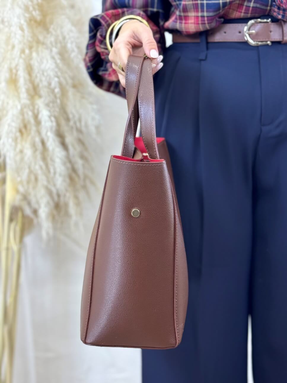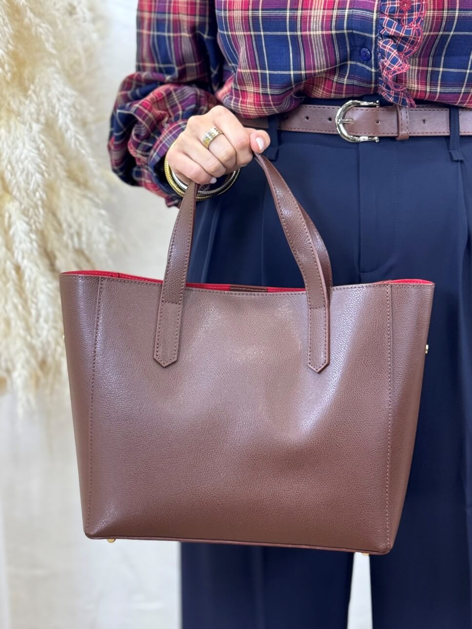 Bolso de piel con asas y forro rojo. Neceser incluido en el interior.