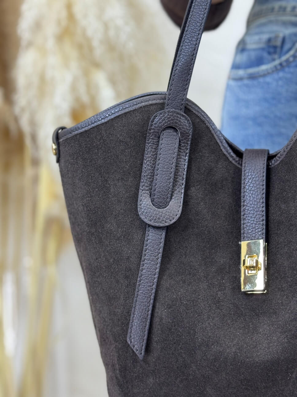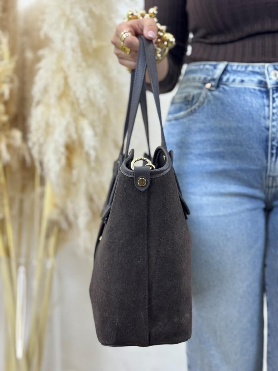 Bolso de piel con asas y broche decorativo para cerrar el bolso. Cierre de cremallera.