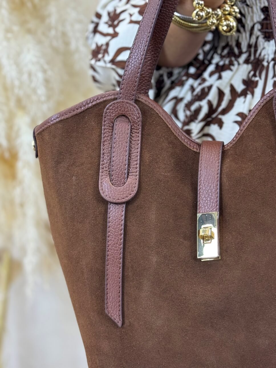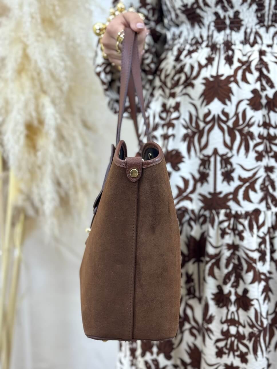 Bolso de piel con asas y broche decorativo para cerrar el bolso. Cierre de cremallera.