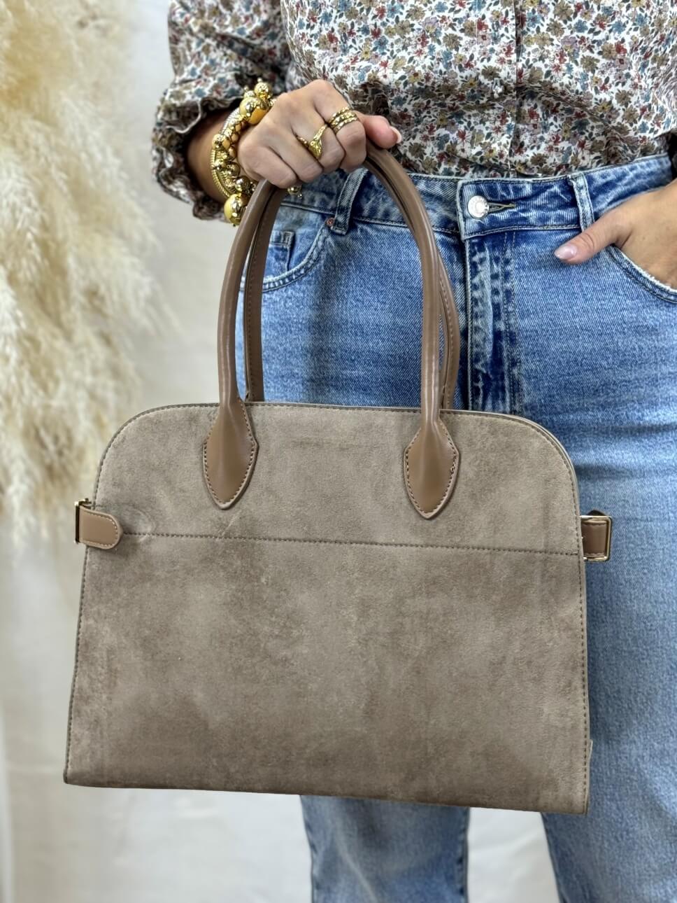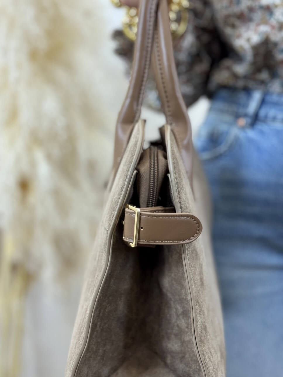 Bolso con materiales combinados, cierre de cremallera y detalle de correas en los laterales.