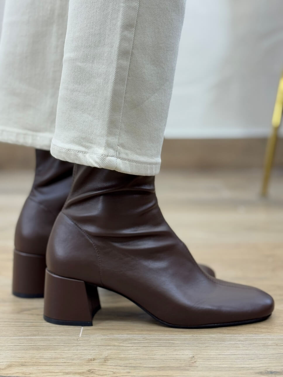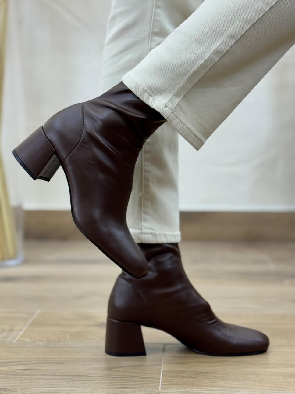 Botín de la marca Corina en tejido polipiel con tacón ancho. Costura en la parte delantera y trasera. No tiene cremalleras.