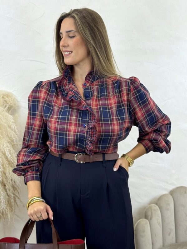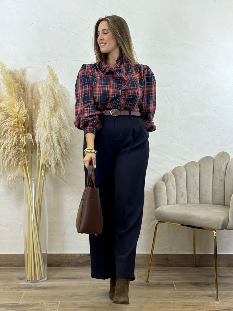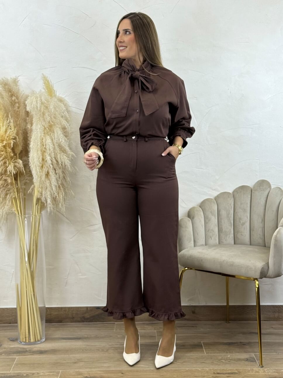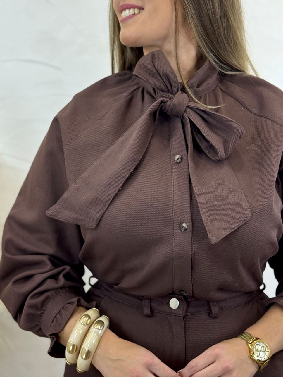 Camisa de loneta con cierre abotonado y lazada en el cuello. Puños engomados con volante.