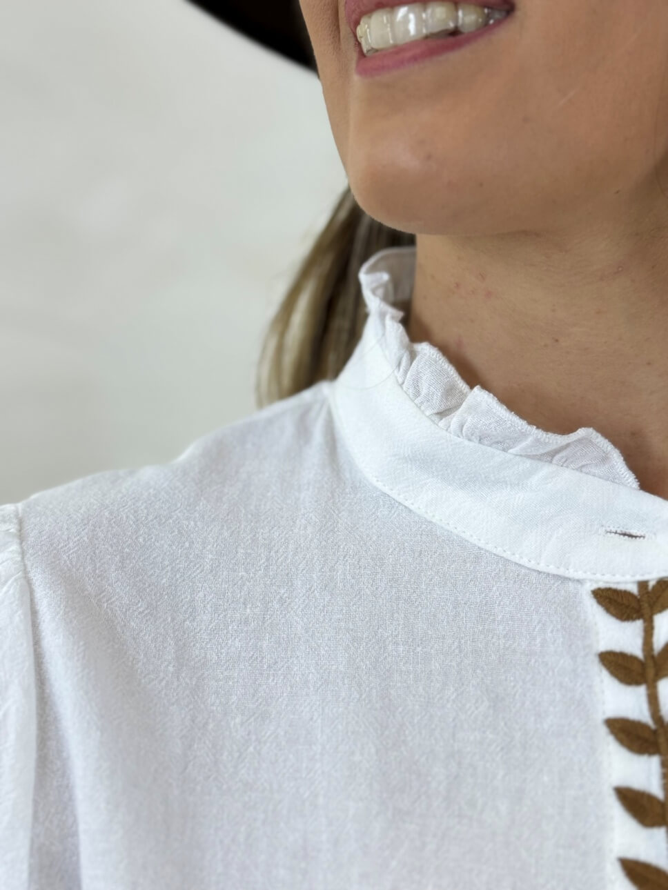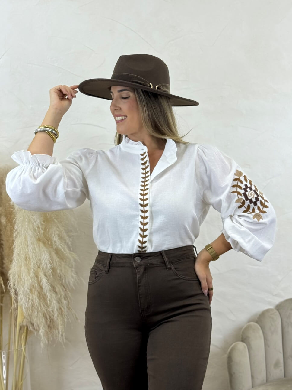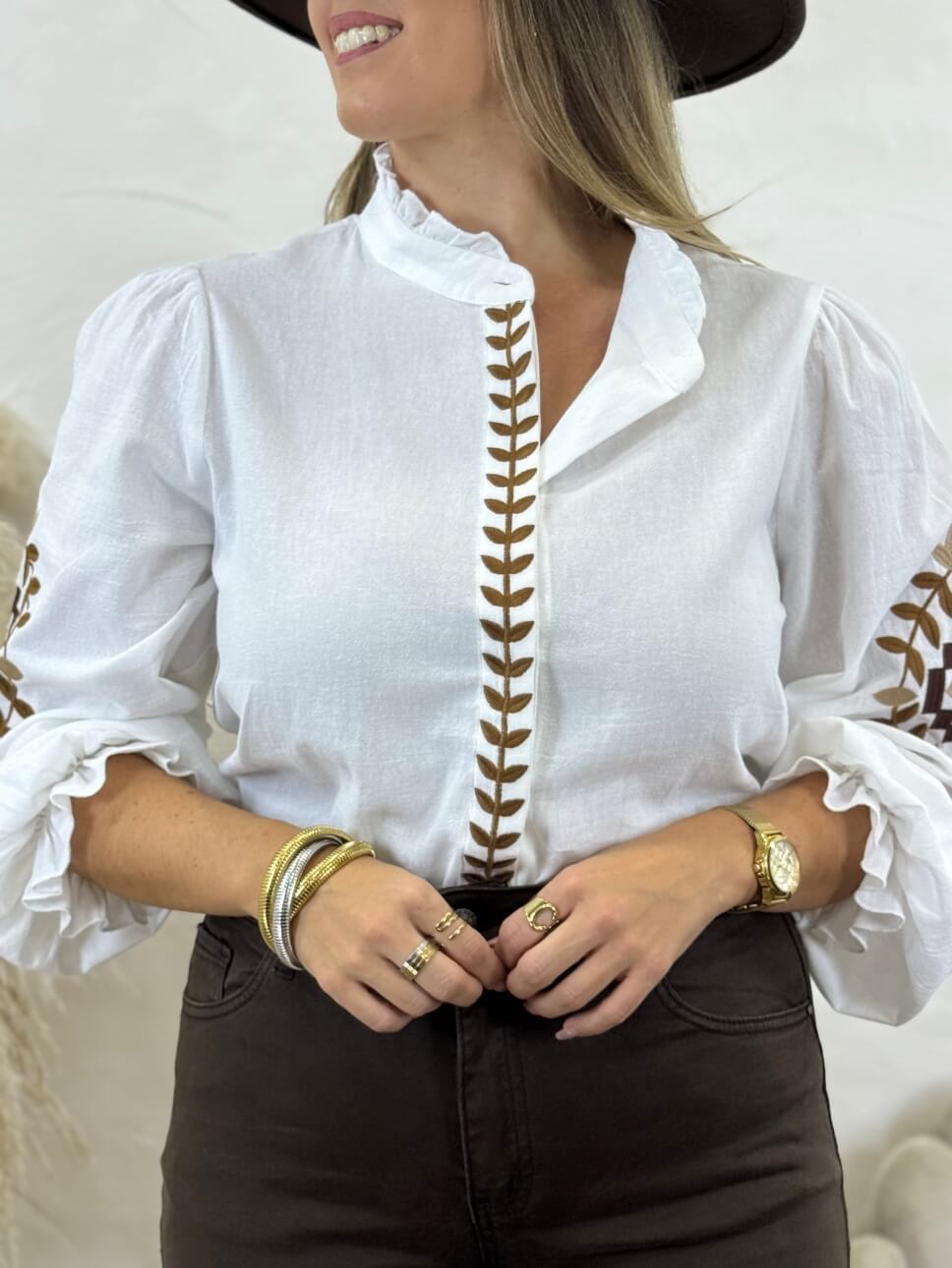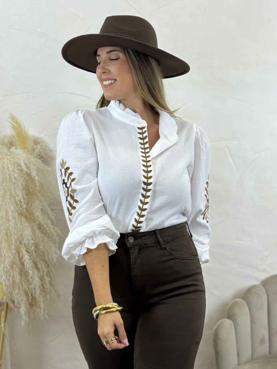 Camisa blanca con bordados en las mangas y en la parte delantera. Cuello mao, manga abullonada y cierre abotonado.