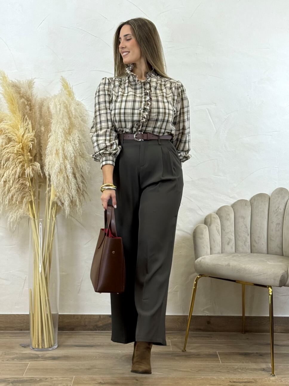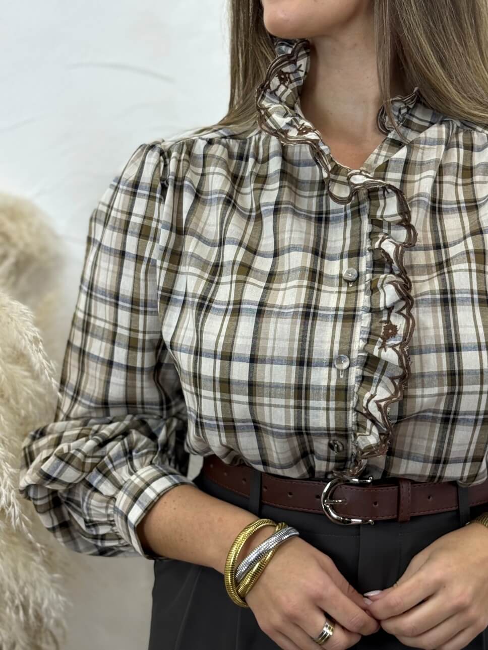 Camisa de cuadros con cierre abotonado, manga abullonada y cuello mao con detalle de volante con bordados que baja por la parte de la costura de los botones.