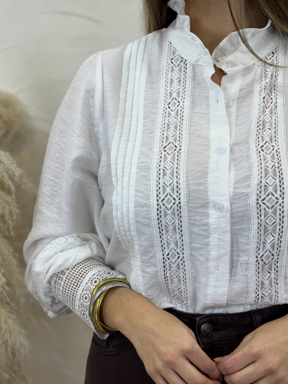 Camisa con bordados y puntillas, cierre abotonado, cuello mao plisado y botones en los puños.