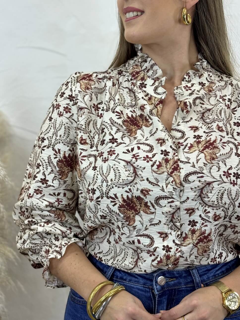 Camisa estampada de flores con cierre abotonado y cuello Mao plisado, puños engomados.
