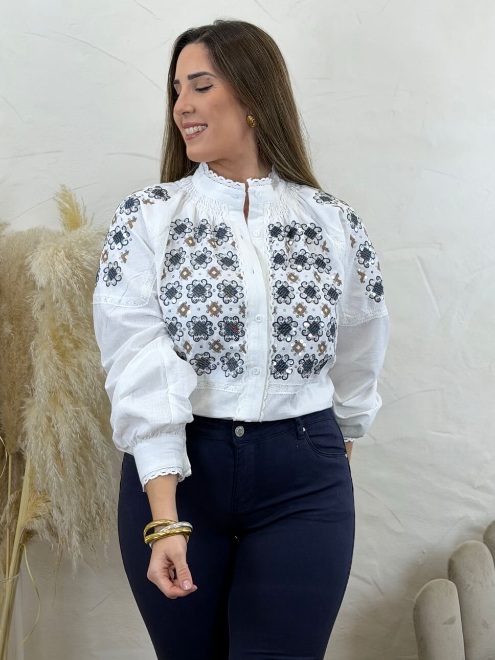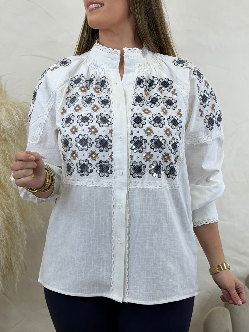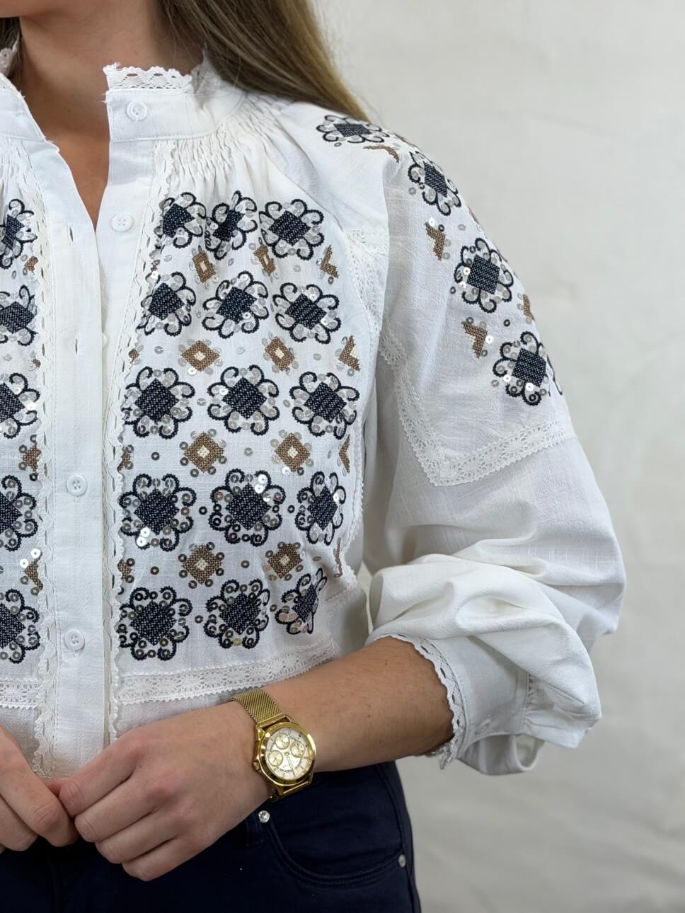 Camisa con cierre abotonado, cuello mao y bordados con lentejuelas en mangas y parte delantera. Detalle de puntilla en cuello, puños, parte trasera y delantera, manga abullonada.