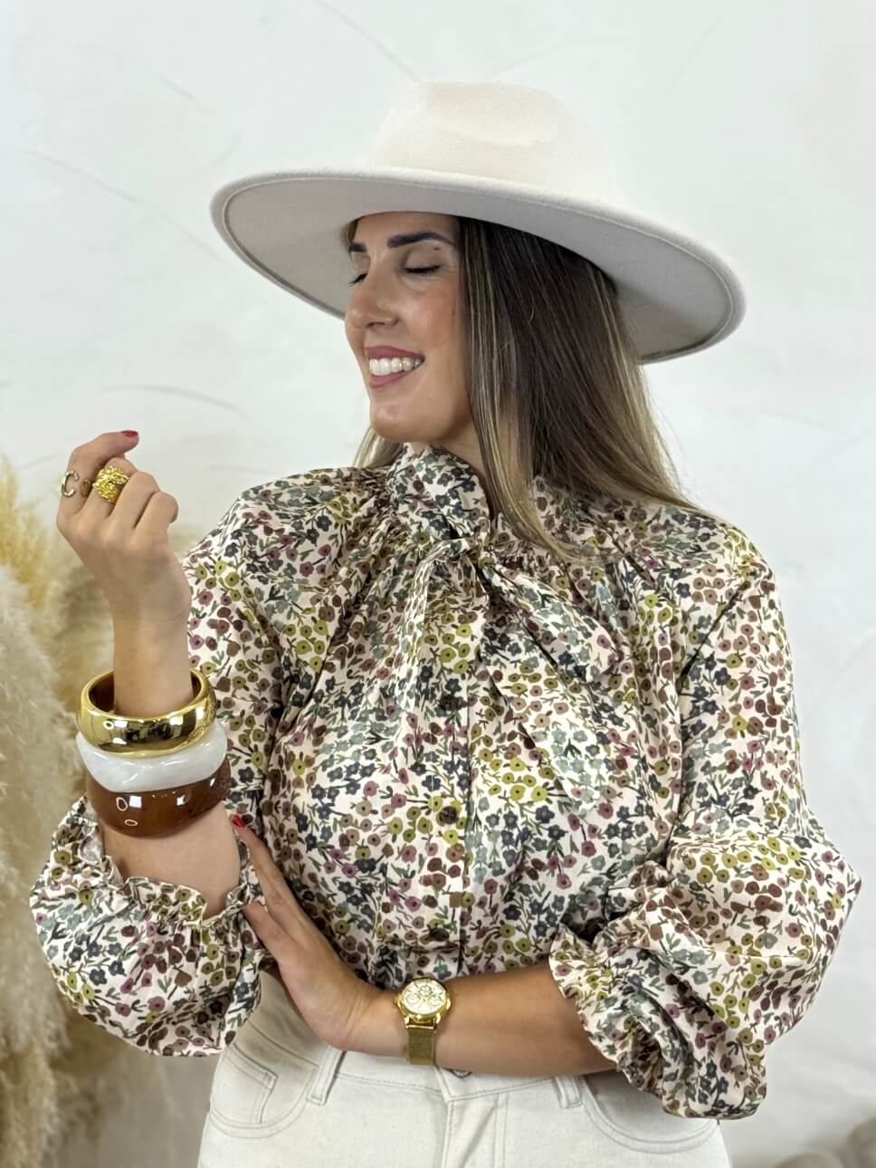 Camisa estampada de flores con maxi lazo y cierre abotonado, manga abullonada, puño engomado.