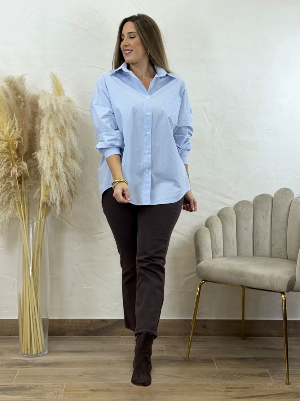 Camisa corte oversize con bolsillo maxi en la parte delantera, cierre abotonado y botón en los puños.
