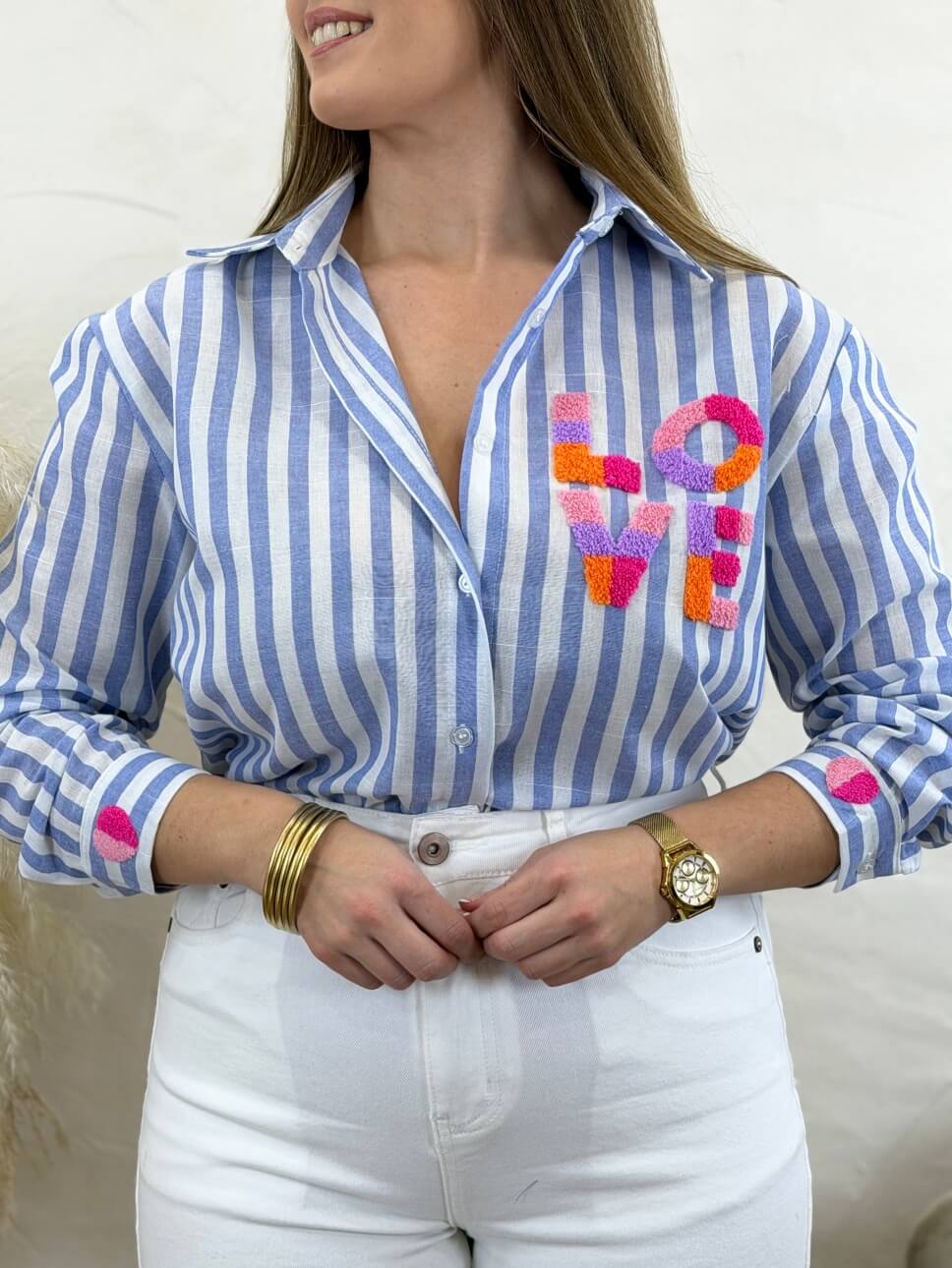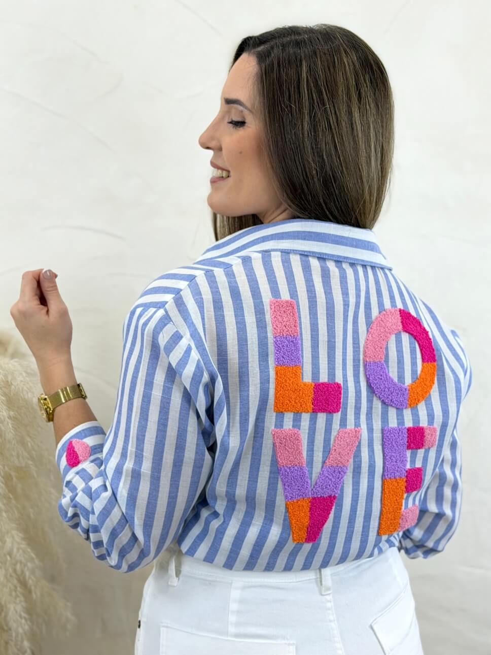 Camisa estampado de rayas verticales con detalle de letras de colores en la parte delantera y trasera y corazón en cada puño.