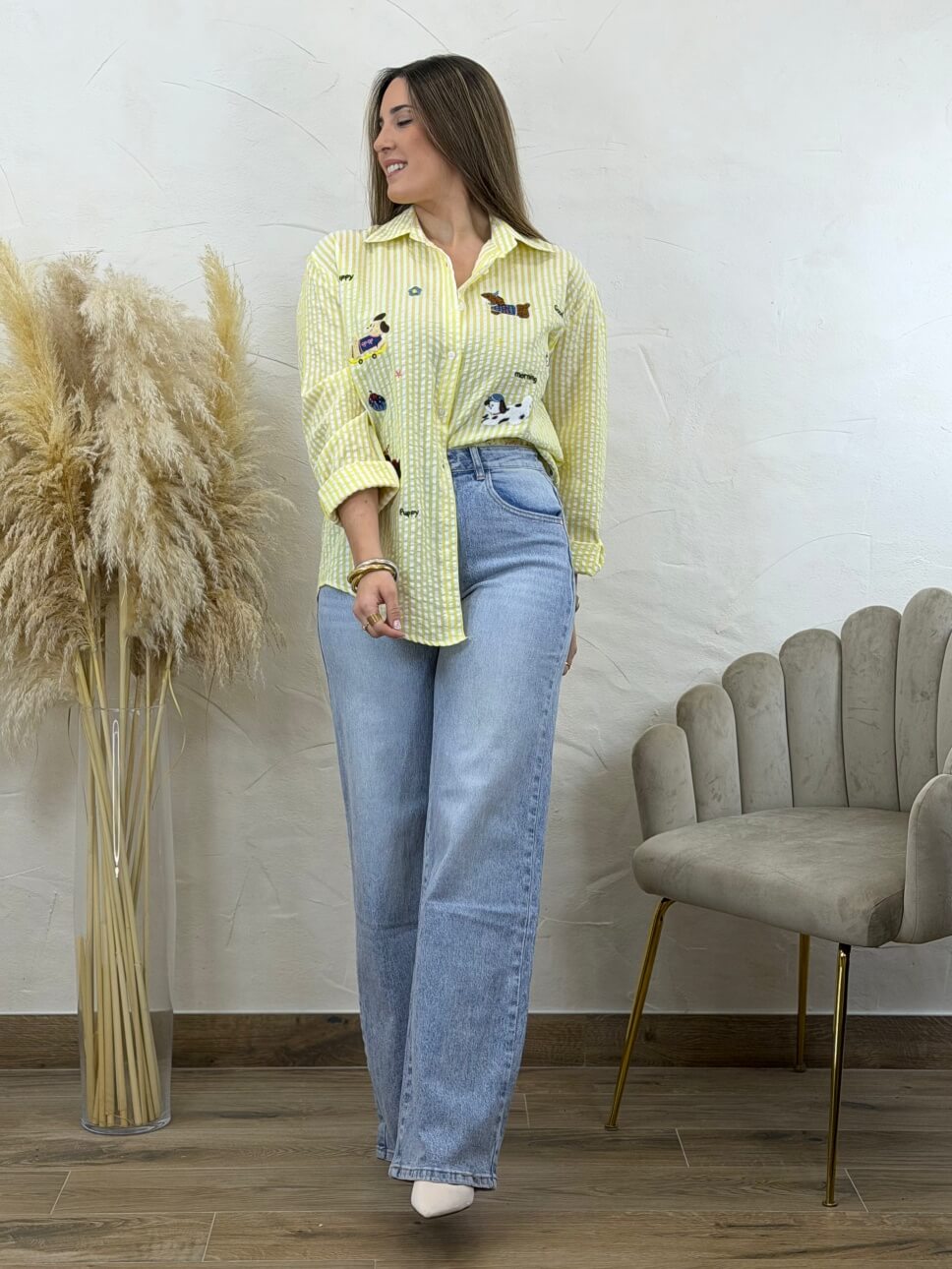 Camisa estampada de rayas verticales con bordados, cierre abotonado.