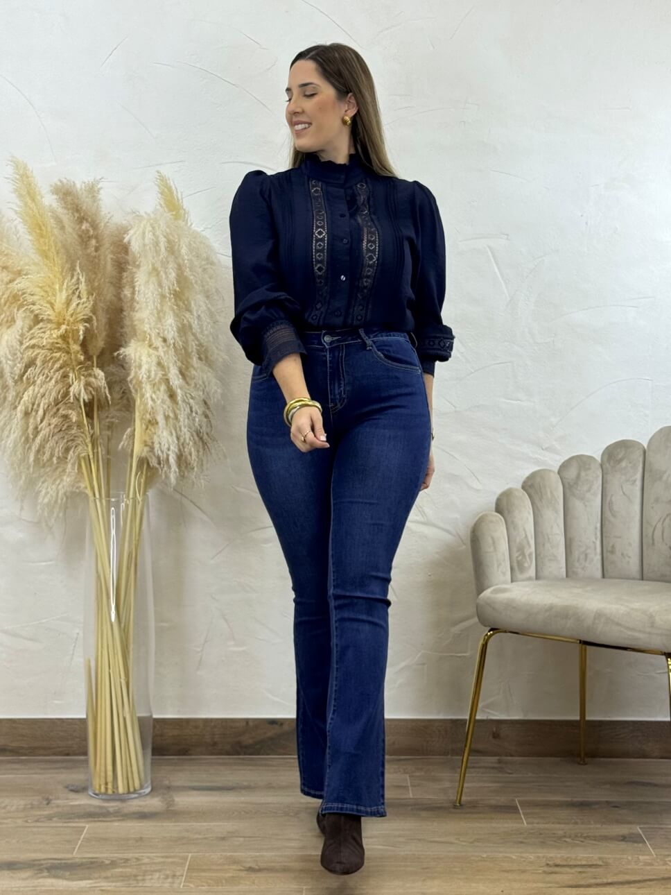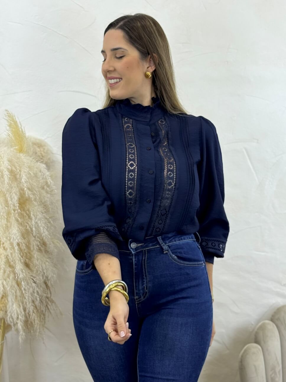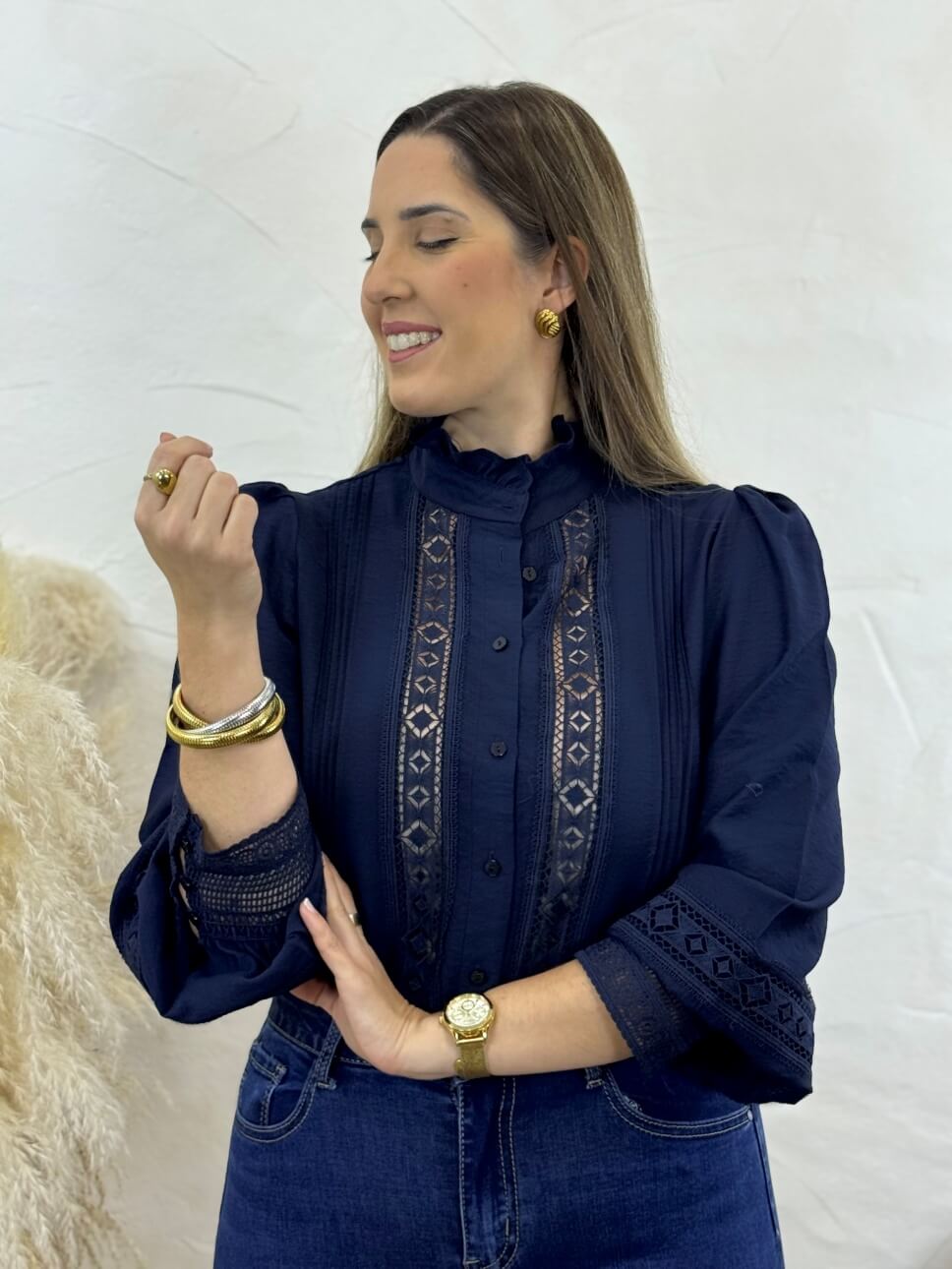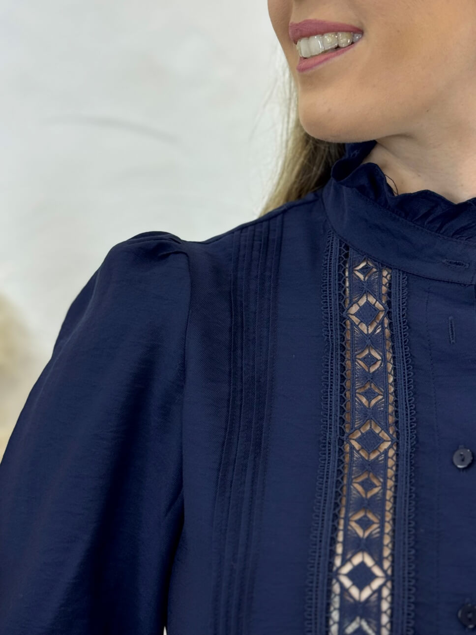 Camisa con cierre abotonado, manga abullonada, detalles de encaje en la parte delantera y en los puños, cuello mao plisado, puños con botones.