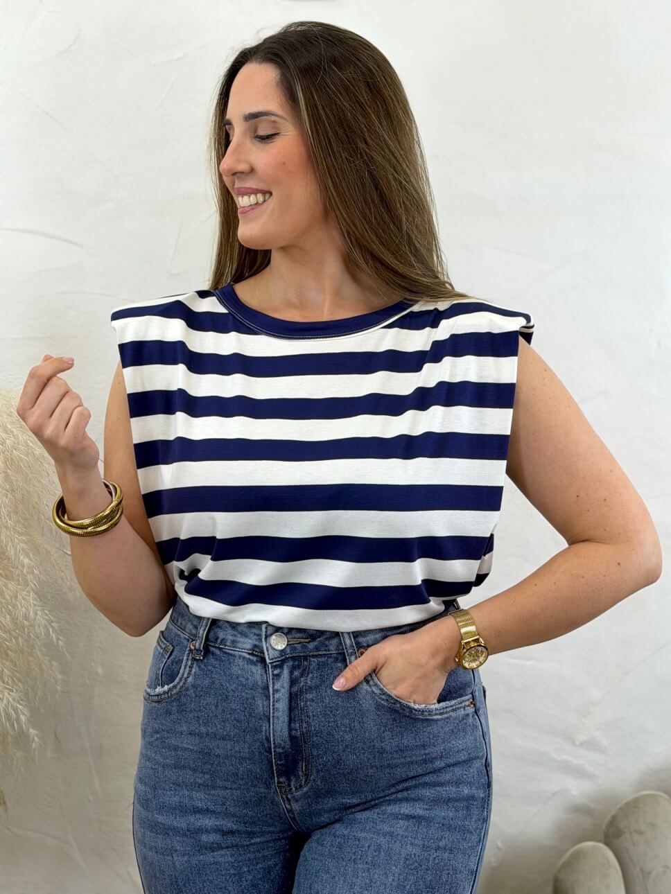 Camiseta de hombreras de la marca Allo Allo con estampado de rayas y estrella estampada en la parte trasera en tejido de relieve.