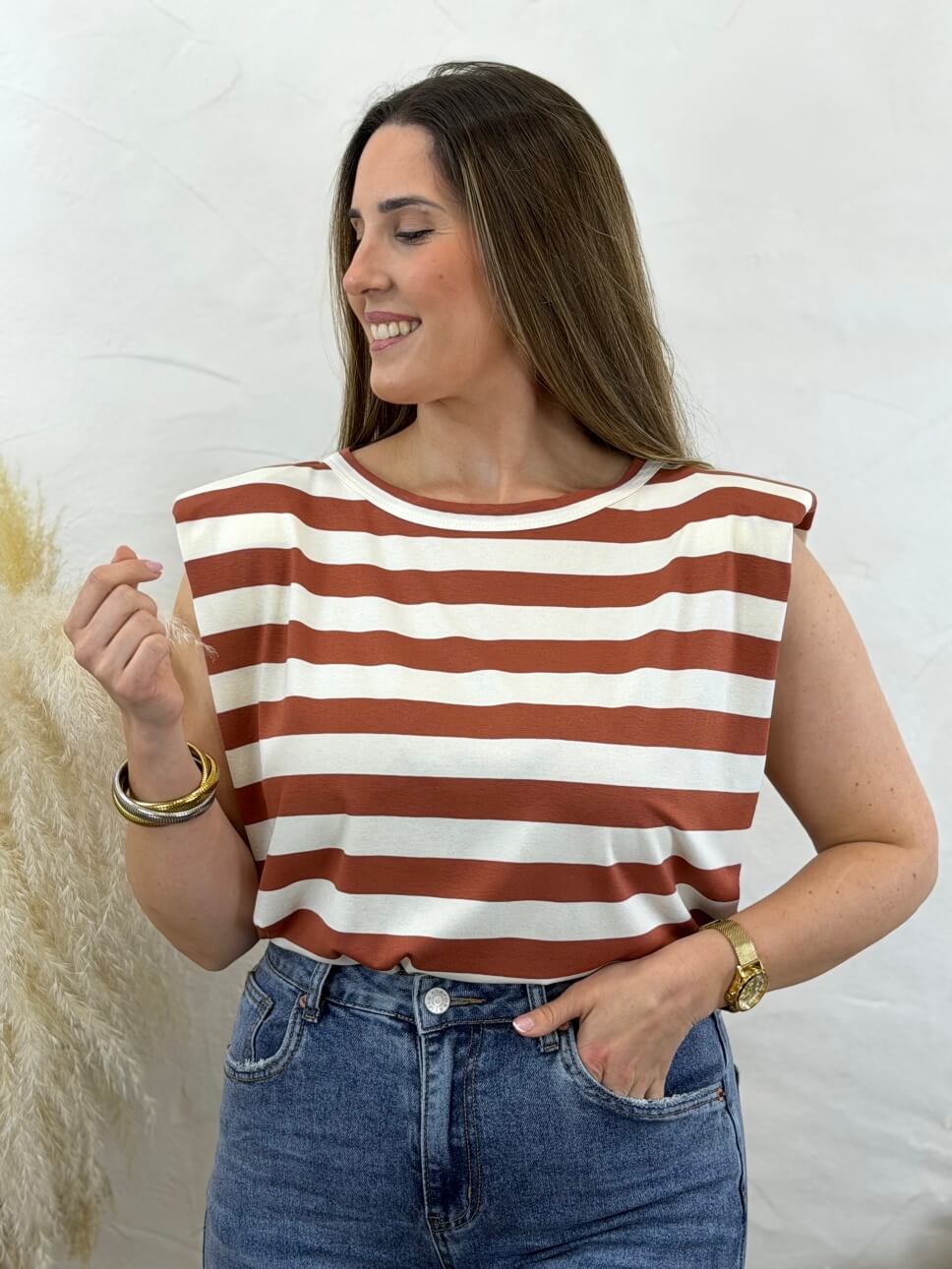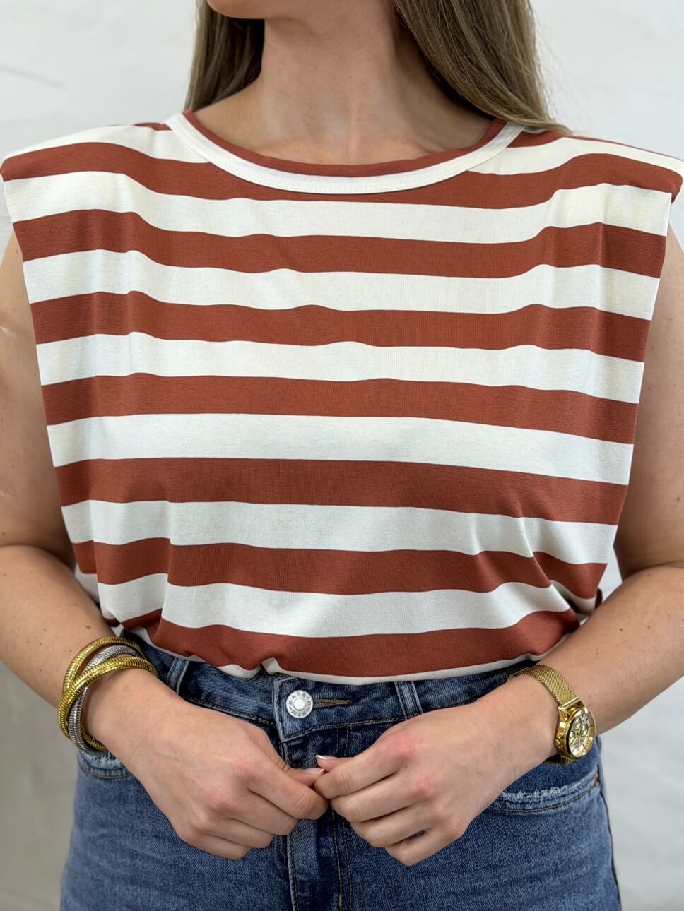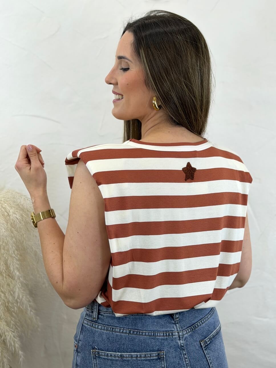 Camiseta de hombreras de la marca Allo Allo con estampado de rayas y estrella estampada en la parte trasera en tejido de relieve.