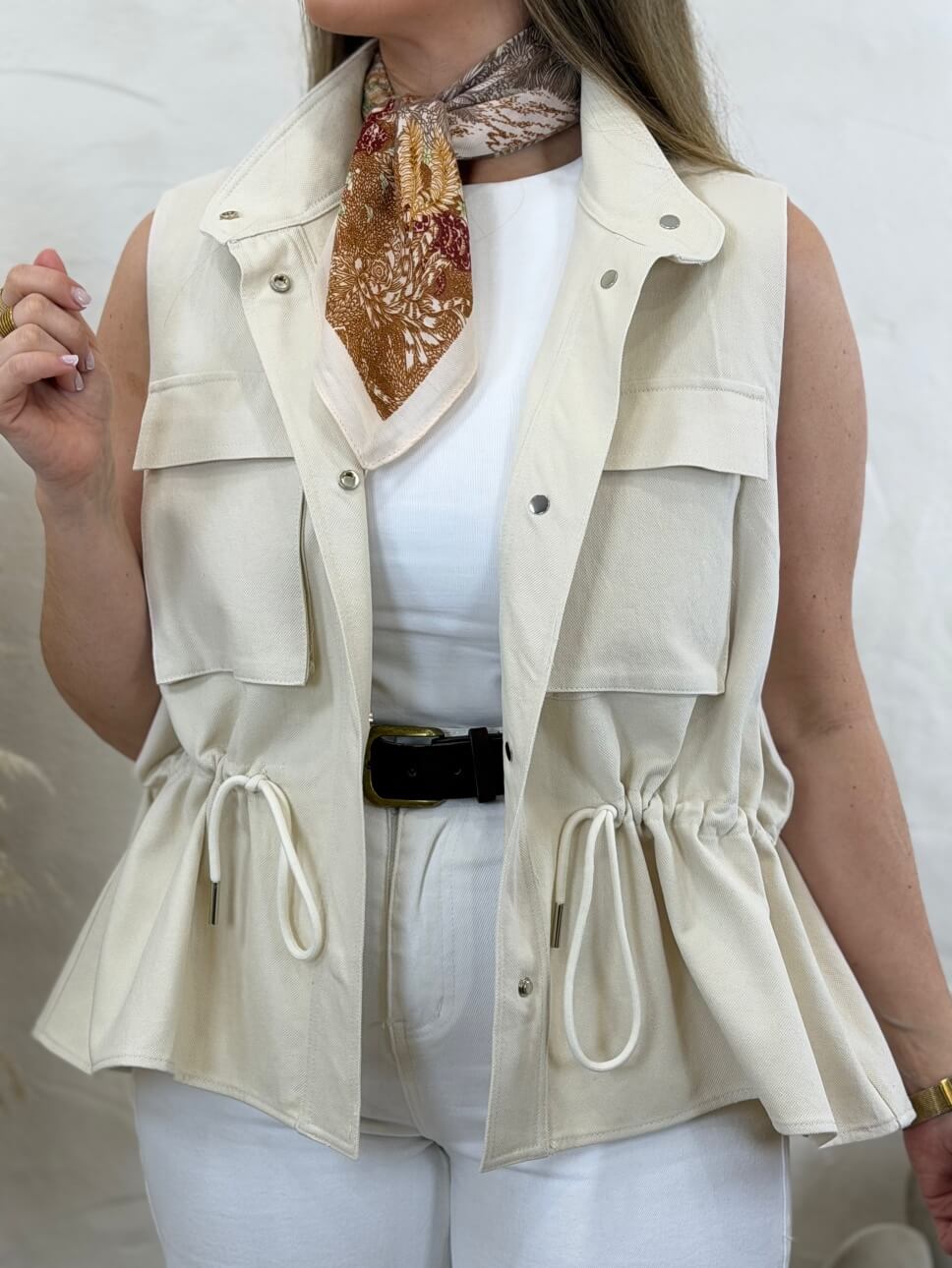 Chaleco tejido loneta con corchetes debajo de las axilas para ajustarlo, cierre con corchetes, ajustable con cordón en la cintura, maxi bolsos en el pecho con solapa.