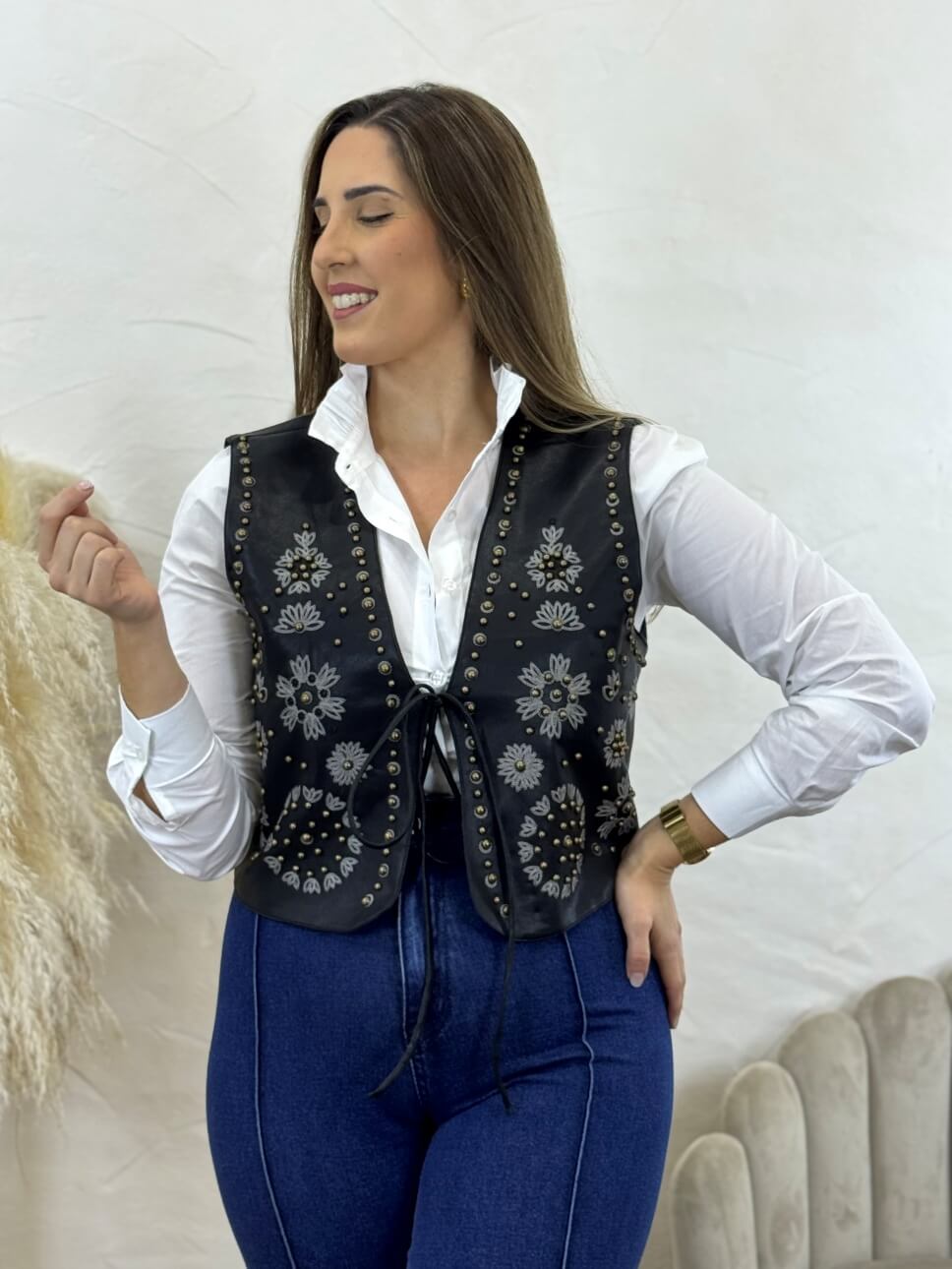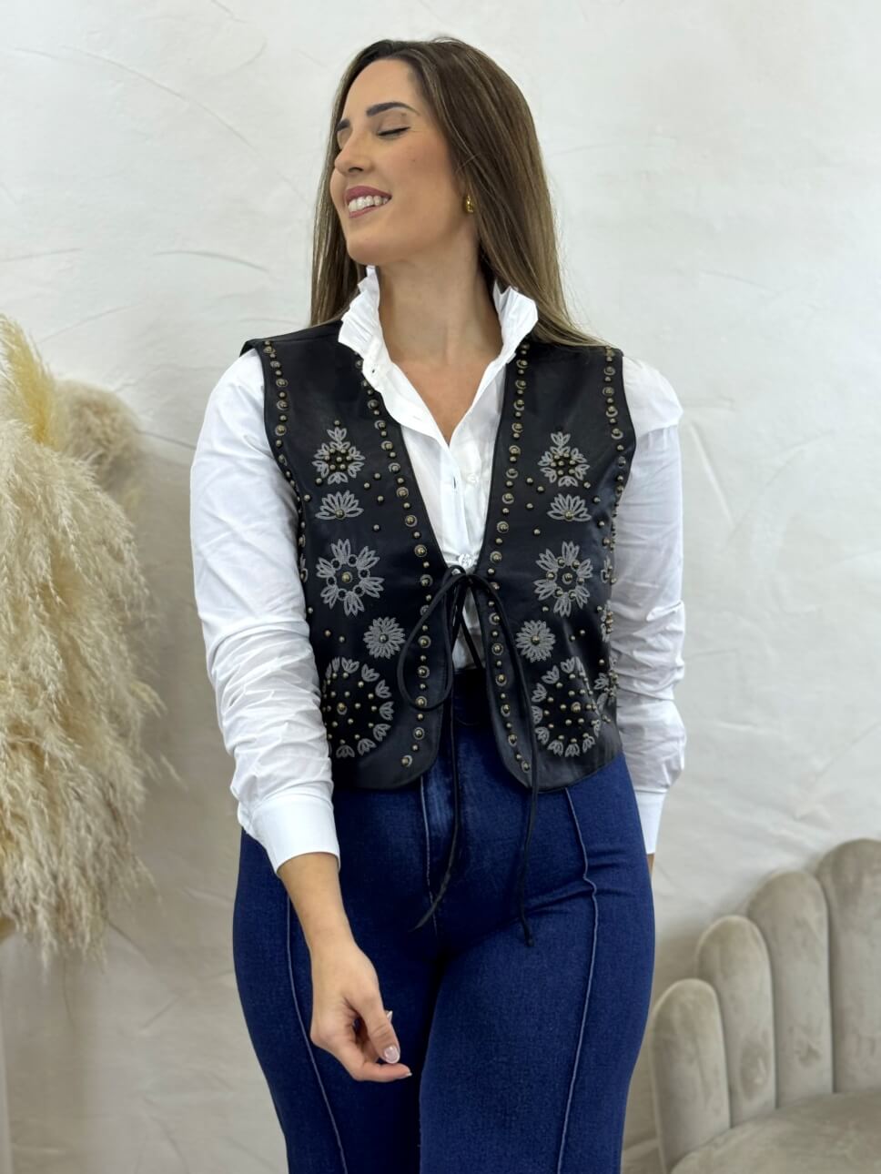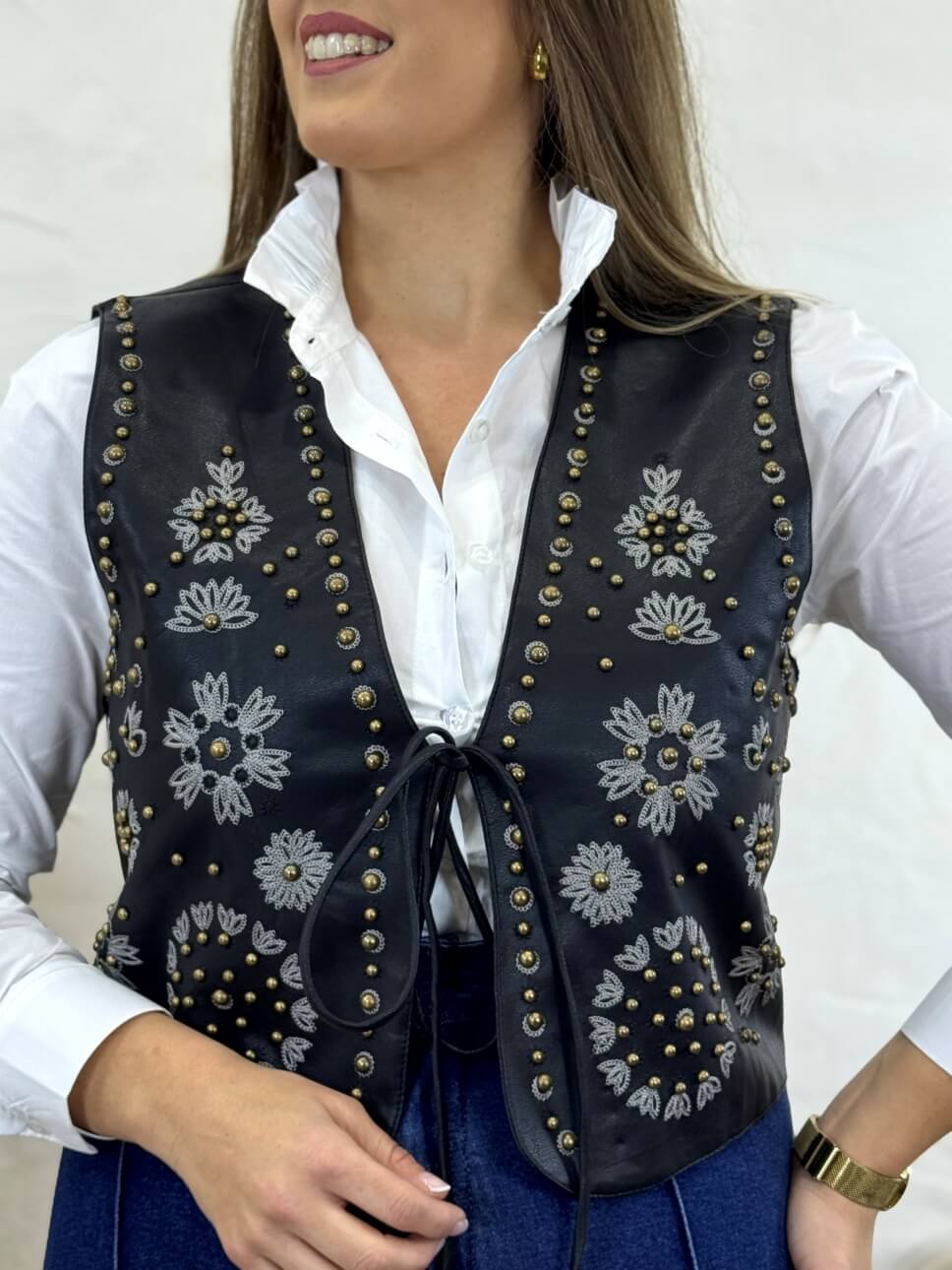 Chaleco tejido polipiel con tachuelas y bordados en la parte delantera, cierre con correa.