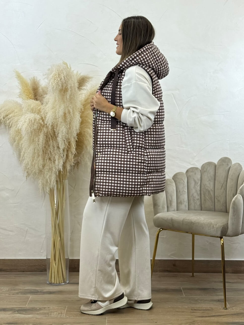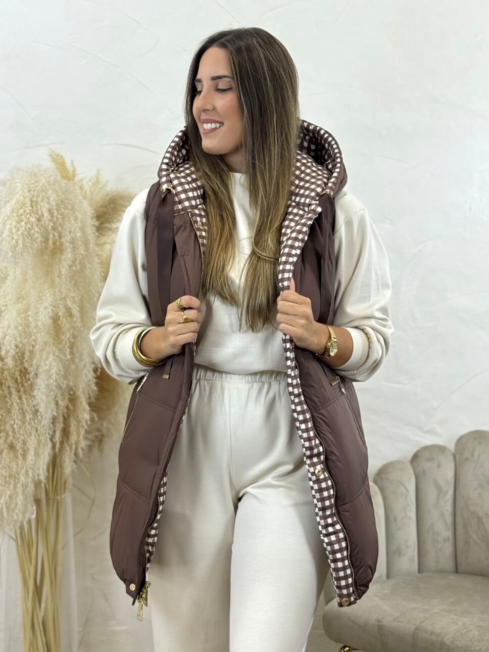 Chaleco de la marca Allo Allo. Es reversible, por un lado liso, por otro lado estampado vichy. Cierre con cremallera y corchetes, bolsillos laterales con cremallera por el lado liso, y sin ella por el lado de vichy, la capucha no es desmontable.
