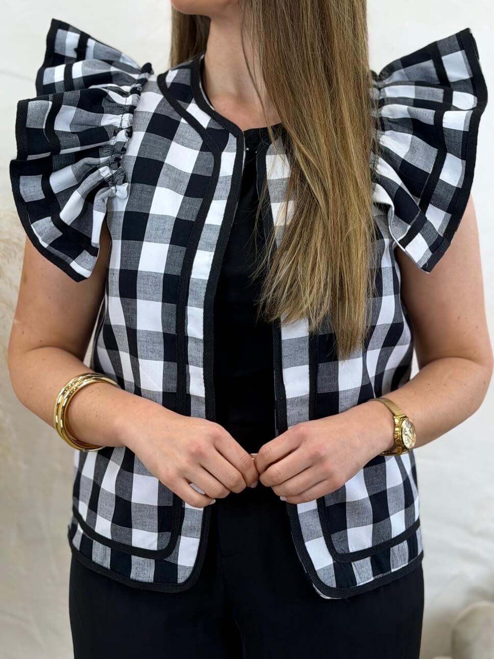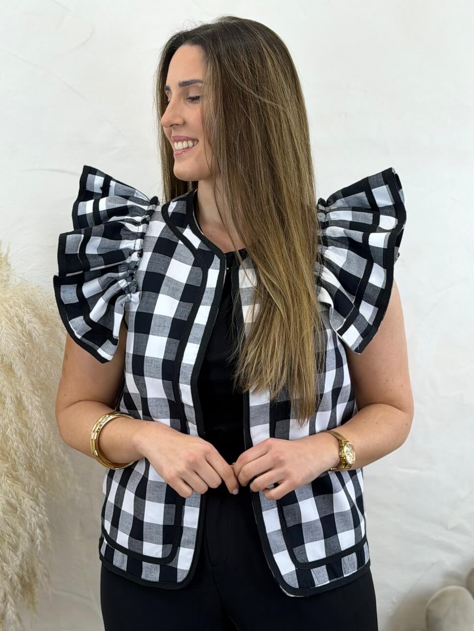 Chaleco estampado vichy con volantes en los hombros.