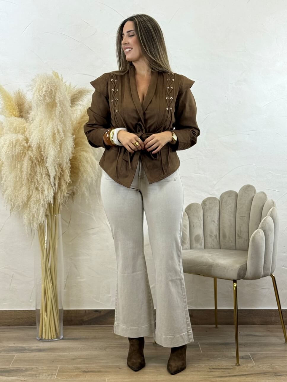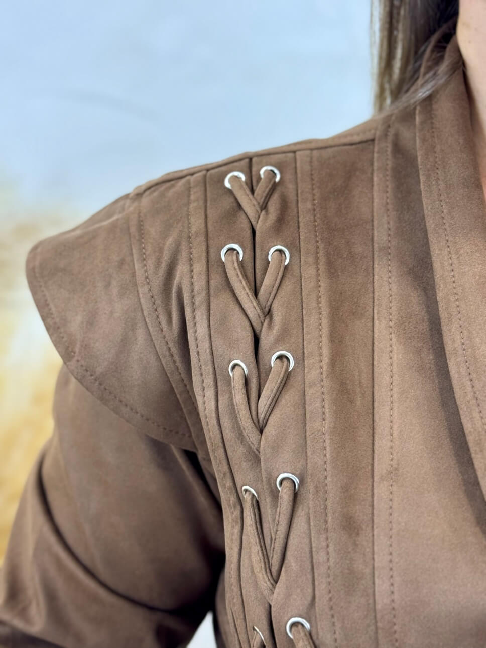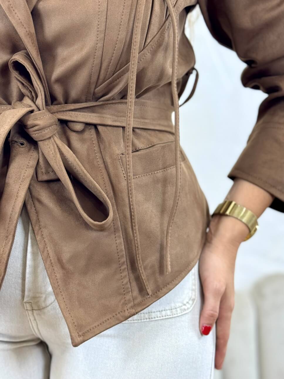 Chaqueta de ante con bolsillos delanteros, cierre con botones, cinturón incluido del mismo tejido. Detalle de cordones del mismo tejido en forma de espiga, volante en los hombros.