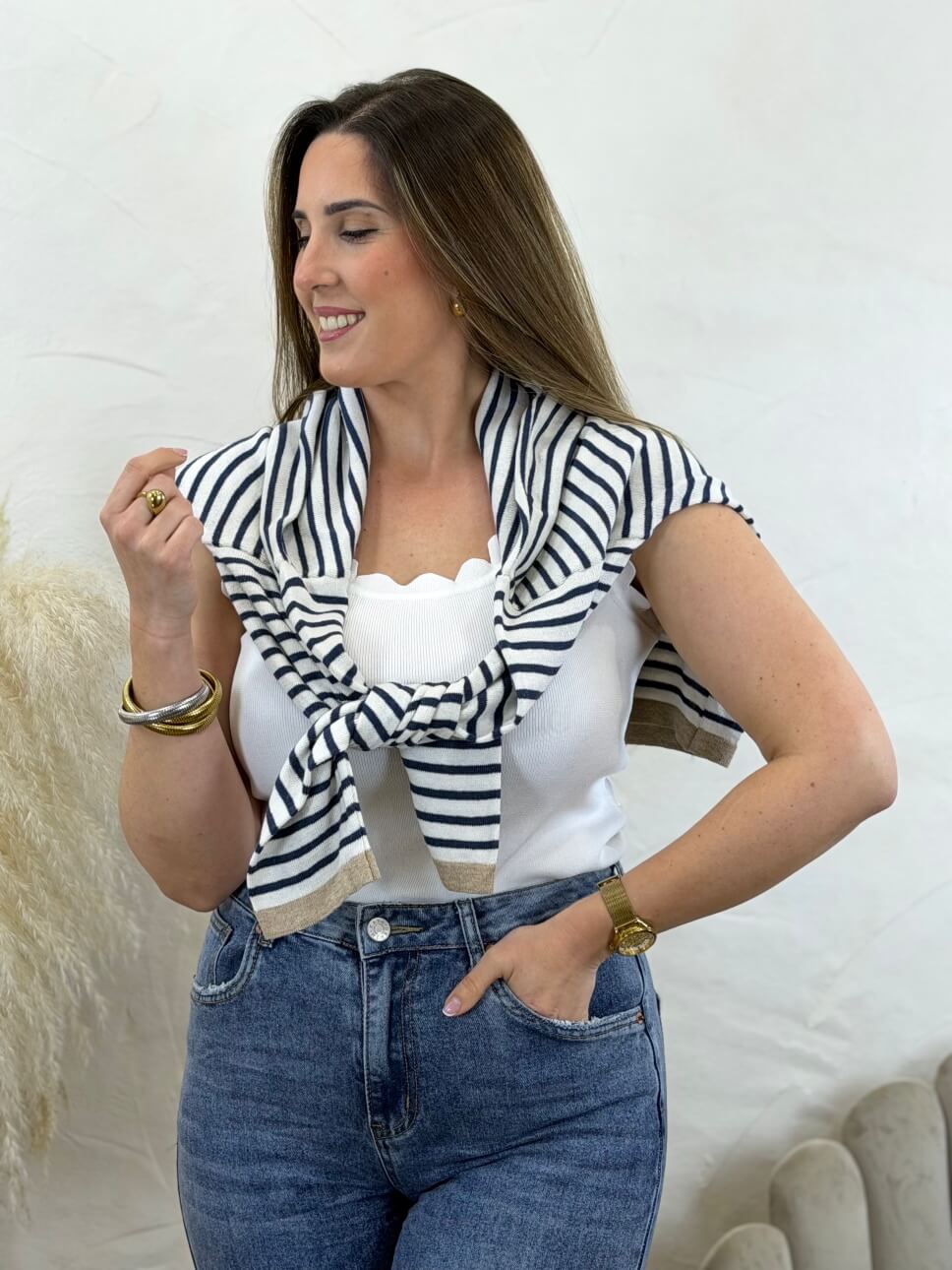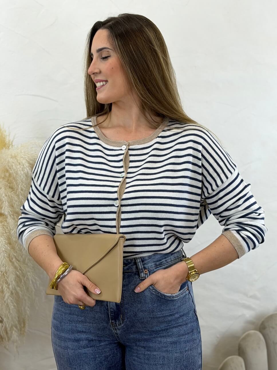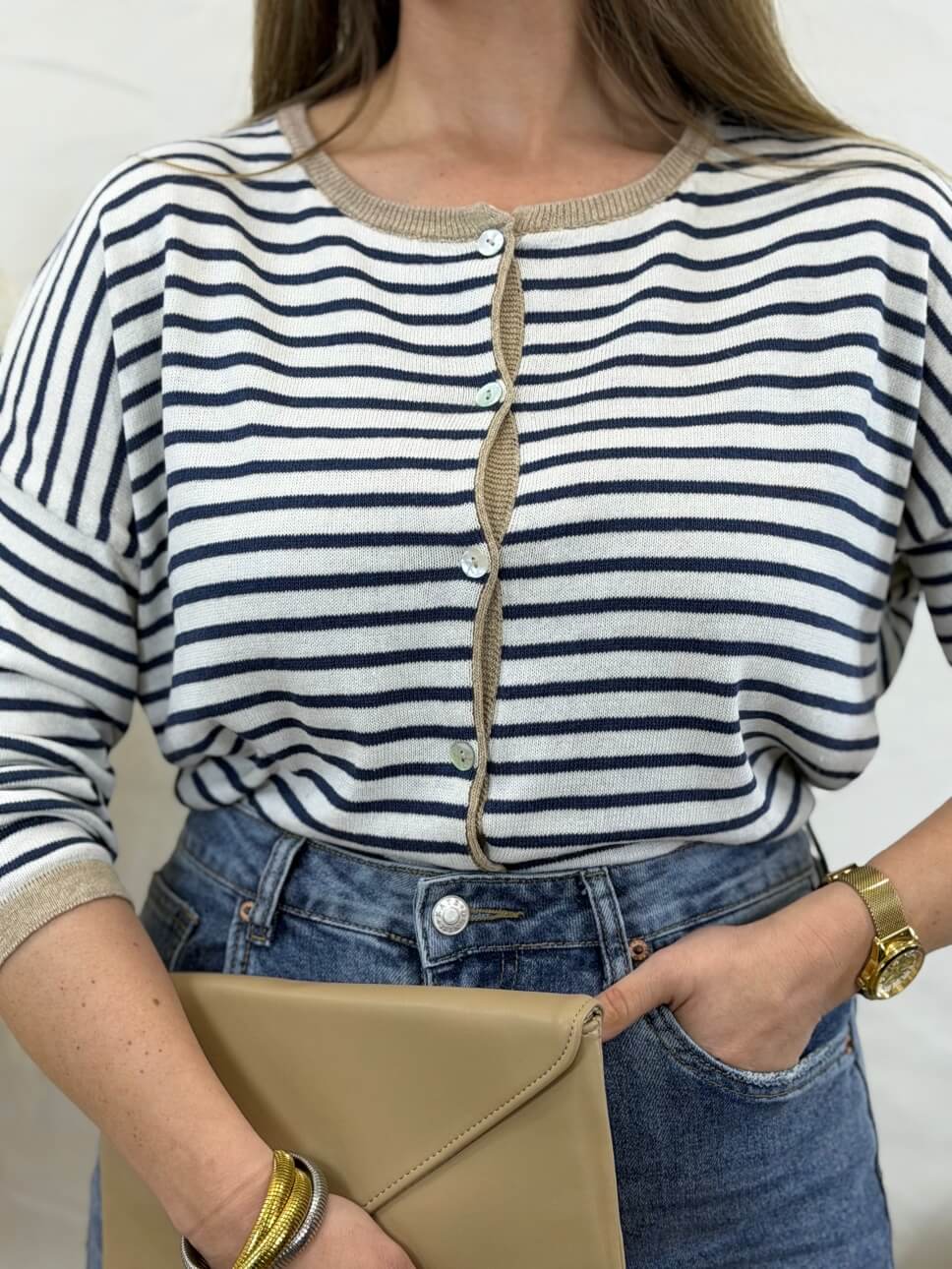 Chaqueta en tejido de hilo estampado de rayas con ribete en otro color.