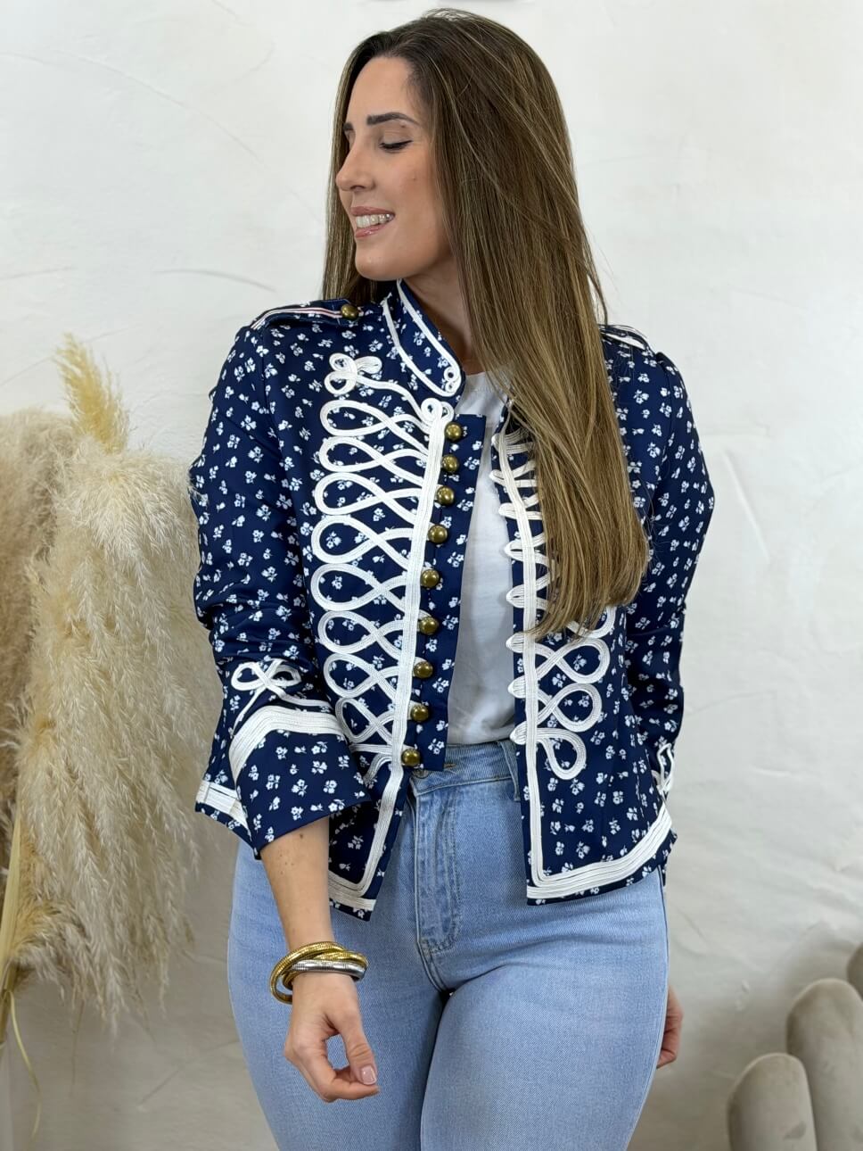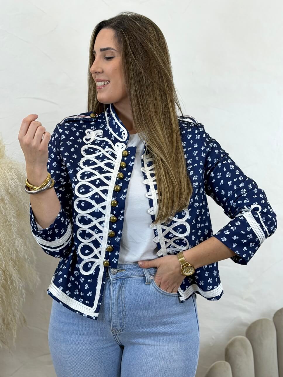 Chaqueta estilo militar con bordados y cierre abotonado con botones dorados.
