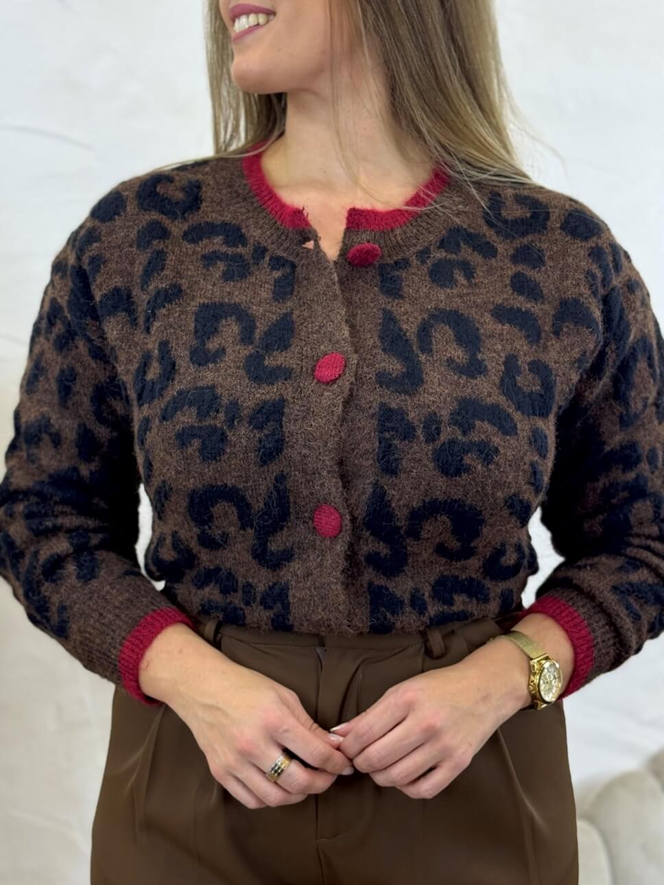 Chaqueta de punto con lana estampado de print combinado con líneas en cuello y puños en color burdeos, botones en color burdeos.