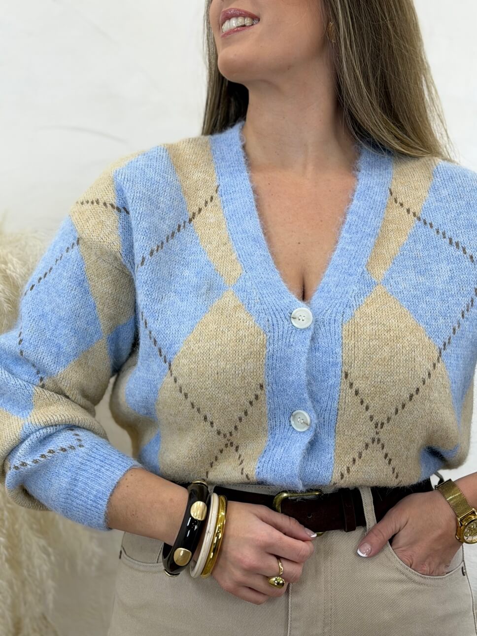 Chaqueta efecto lana estampado de rombos con cierre abotonado.