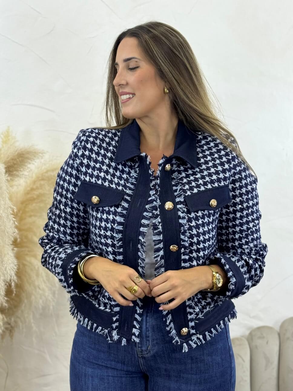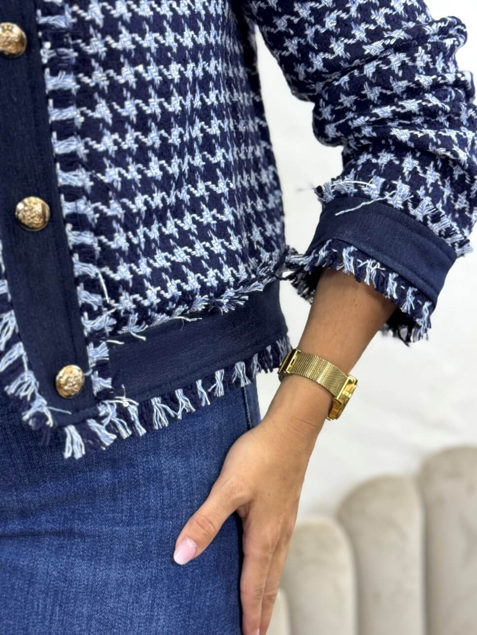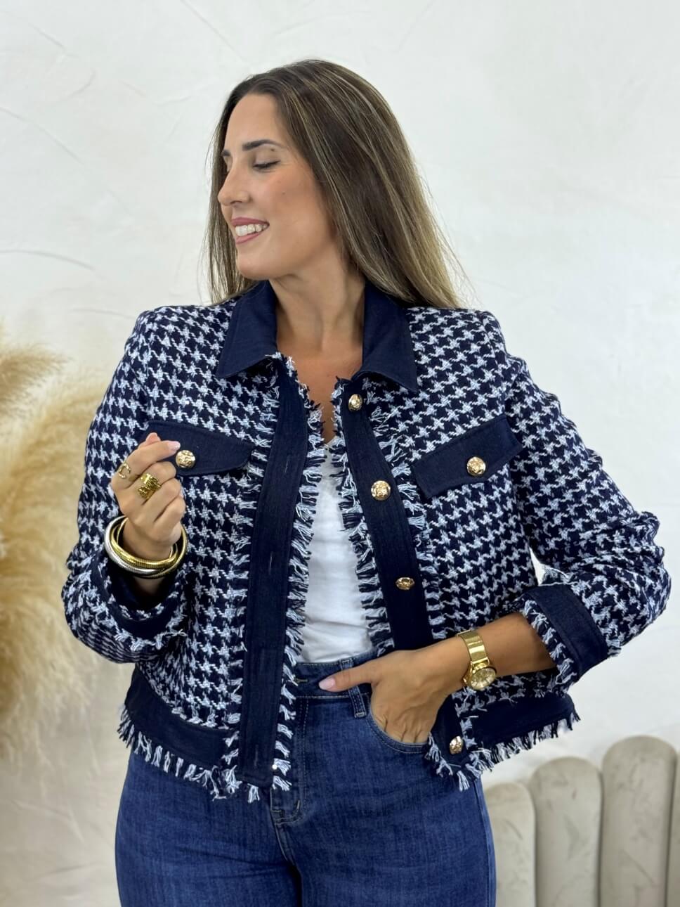 Chaqueta tweed combinando tejido denim con estampado pata de gallo, cierre con botones dorados, bolsillos delanteros falsos con solapas y botones dorados. Forro interior y hombreras.