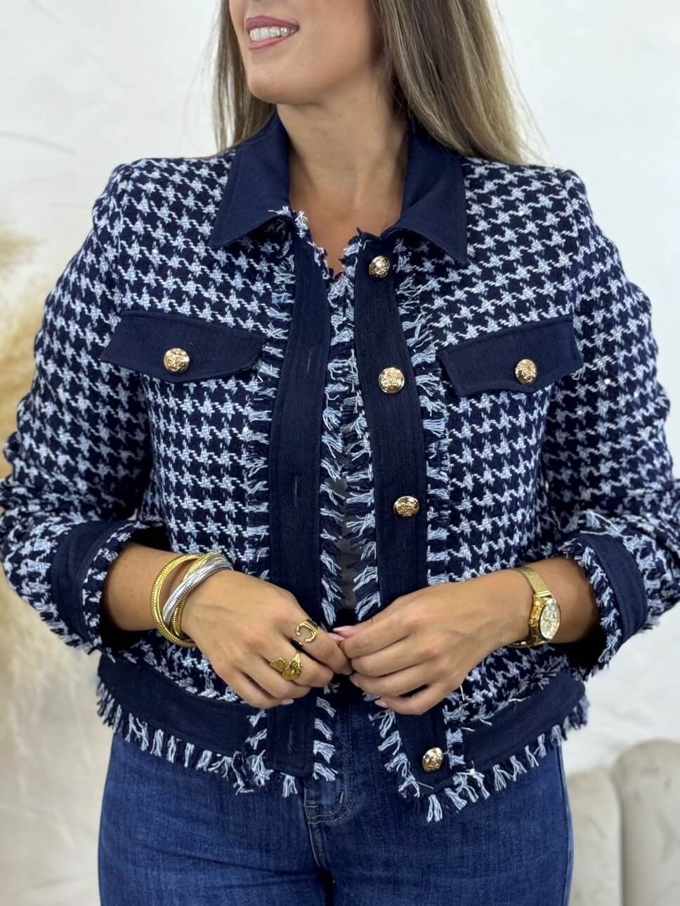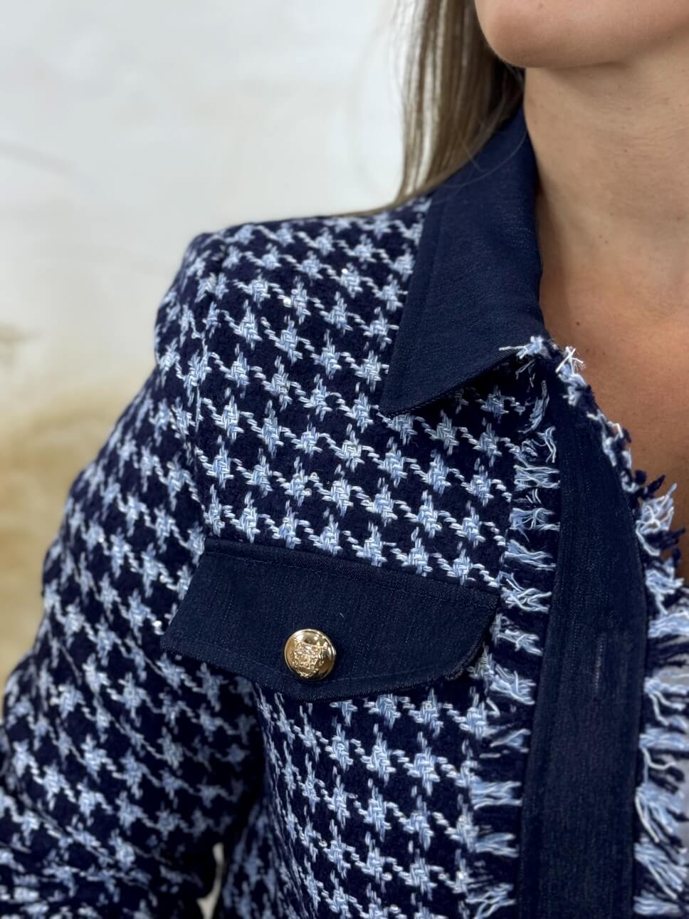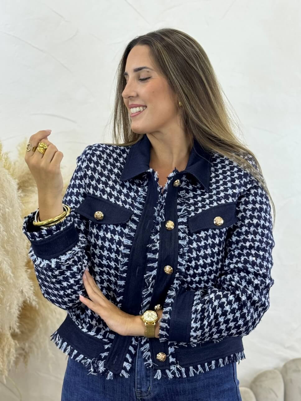 Chaqueta tweed combinando tejido denim con estampado pata de gallo, cierre con botones dorados, bolsillos delanteros falsos con solapas y botones dorados. Forro interior y hombreras.