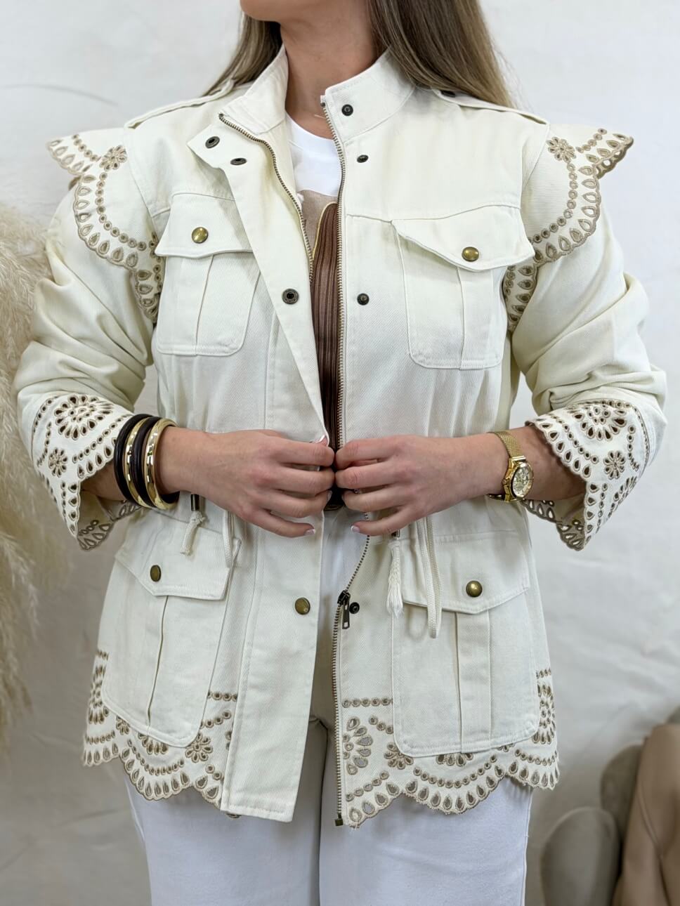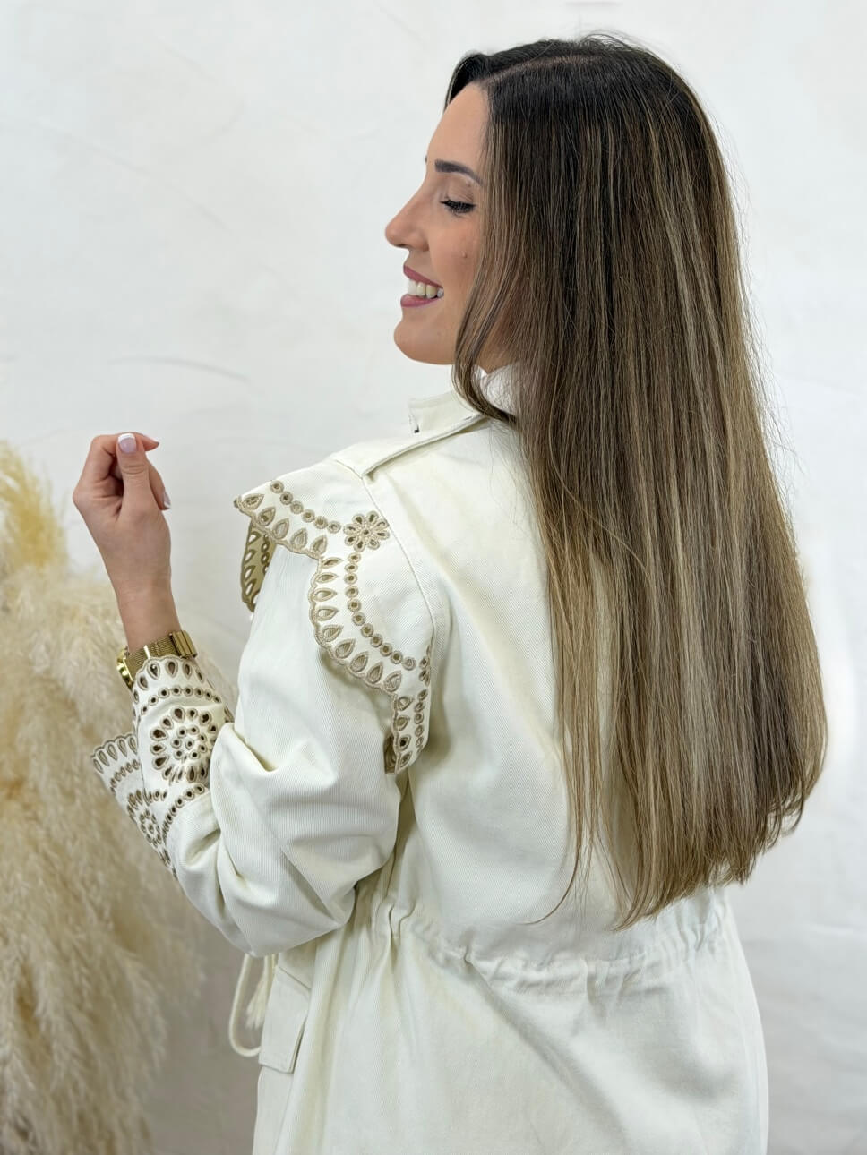 Chaqueta con cierre de cremallera y corchetes. Volantes en los hombros con batista perforado, mismo detalle en puños y parte baja. Bolsillos con solapa y corchetes en la parte delantera, cordón ajustable en la cintura.
