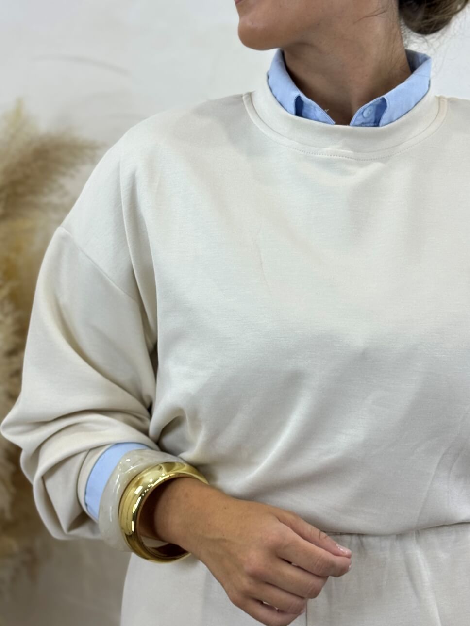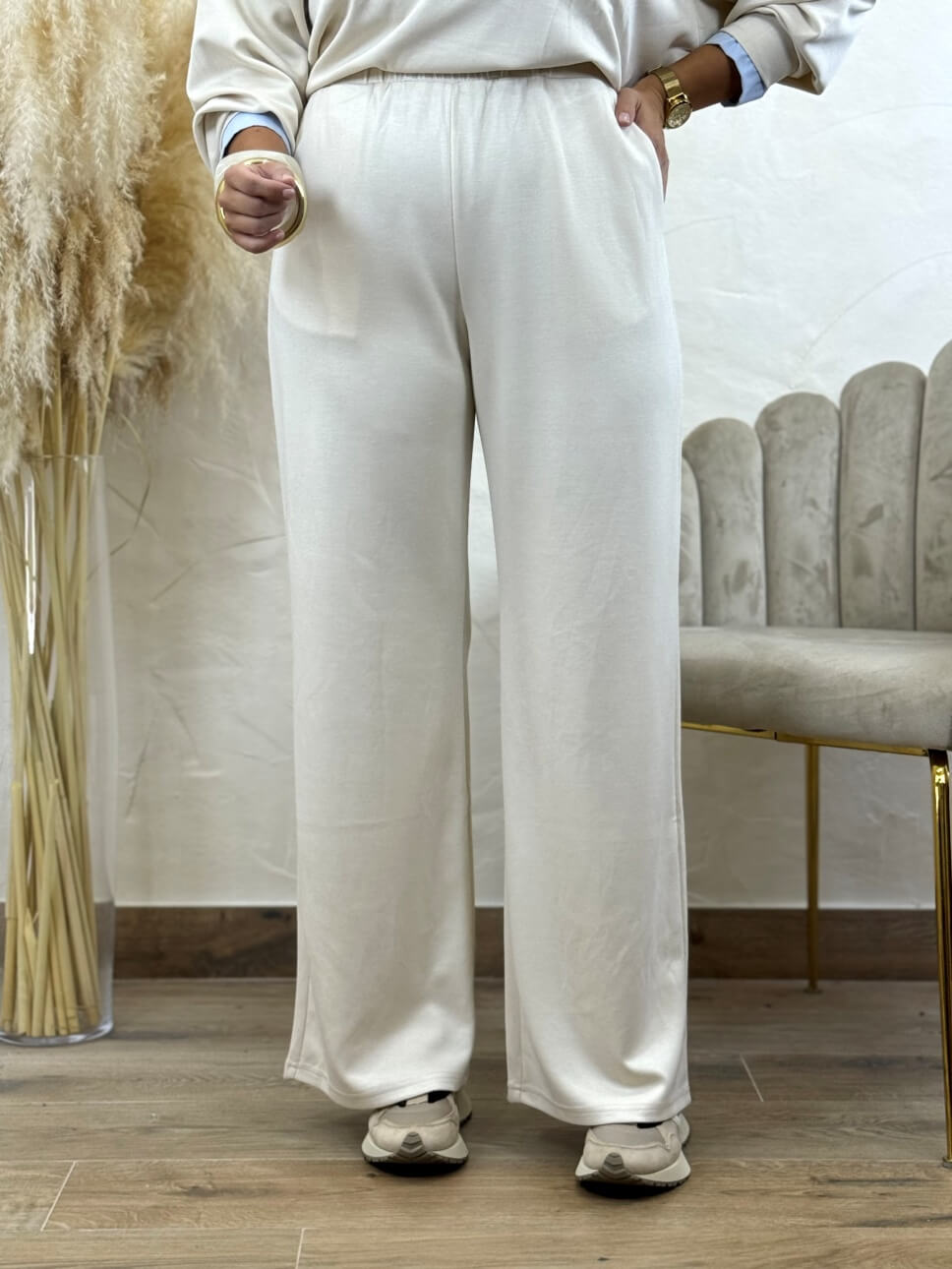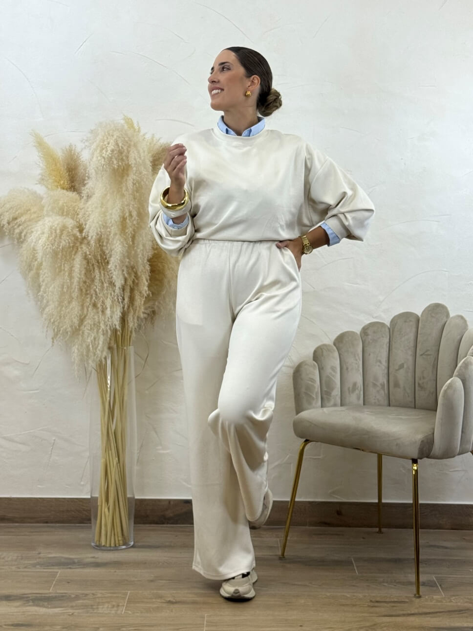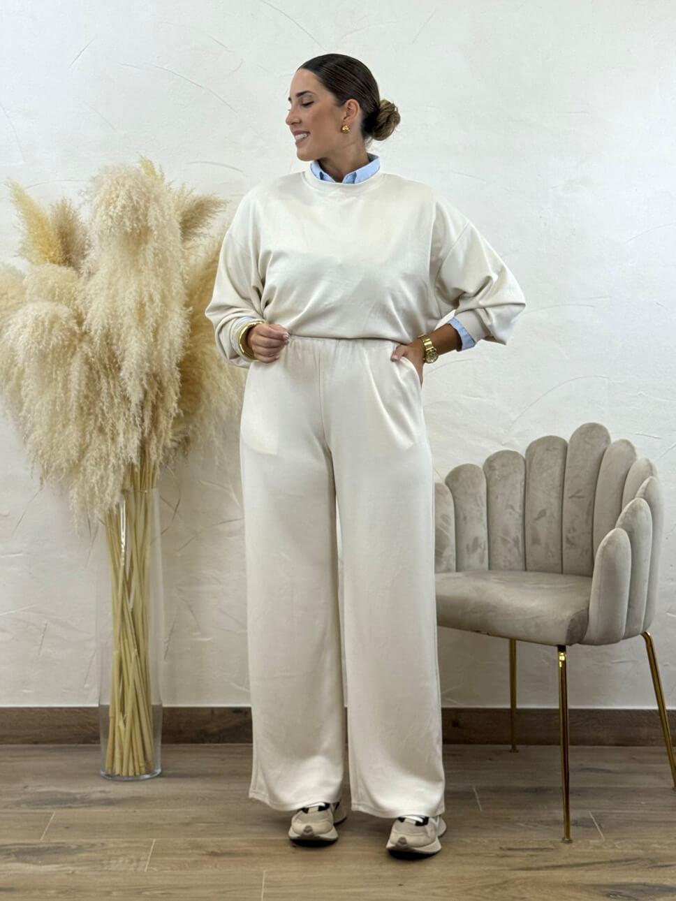 Conjunto de sudadera de cuello redondo y pantalón ancho con goma en la cintura y bolsillos laterales.