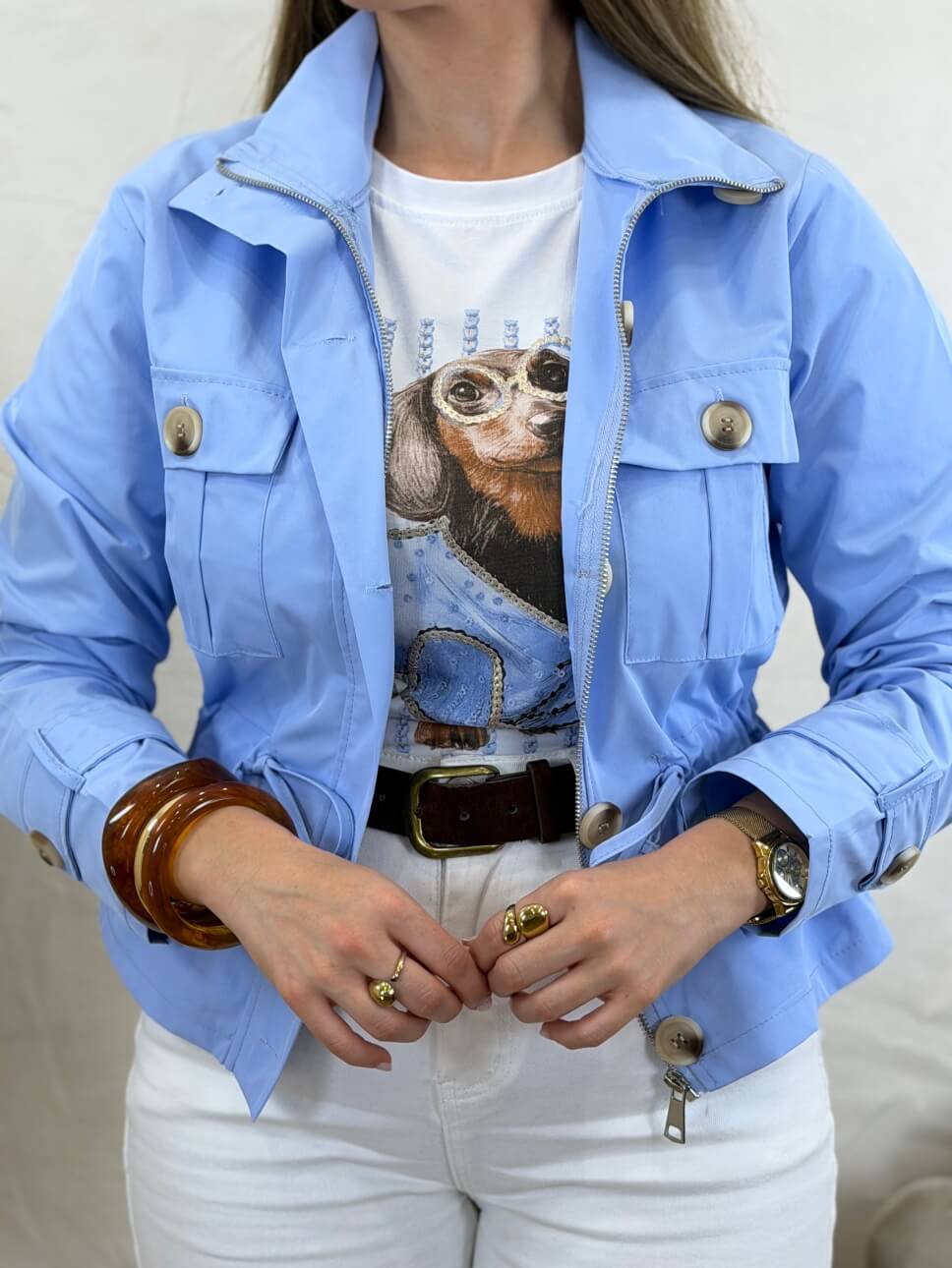 Cortavientos con cierre de cremallera y abotonado, bolsillos en la parte del pecho con solapa y botón. cintura engomada con tira para ajustar, detalle de correa con botón en los puños.