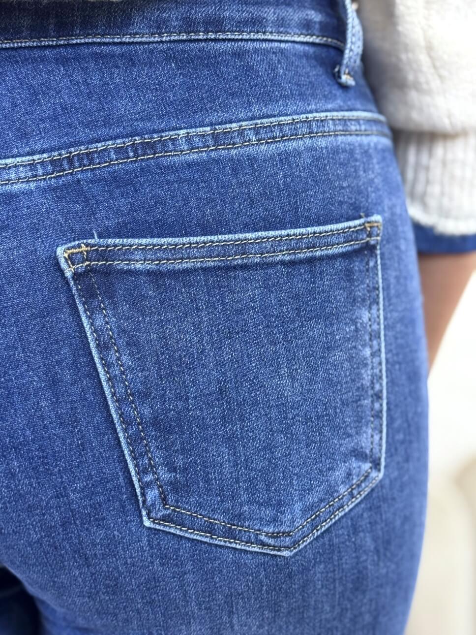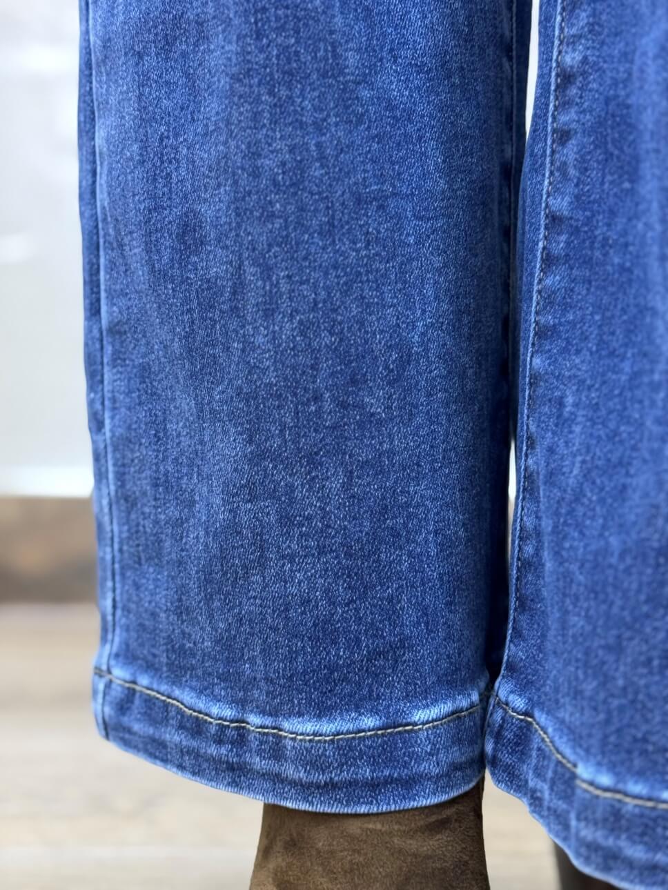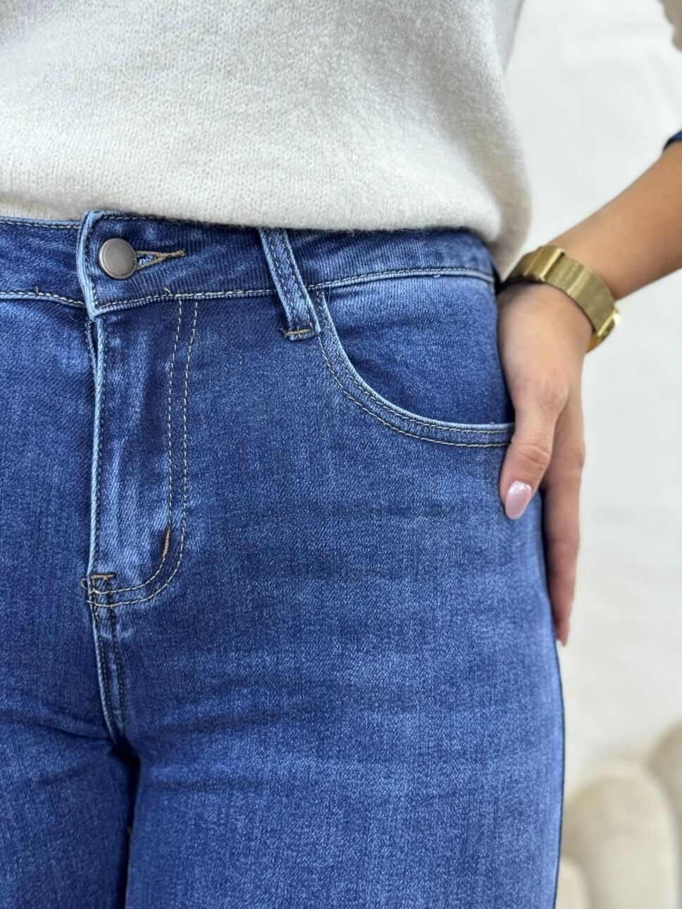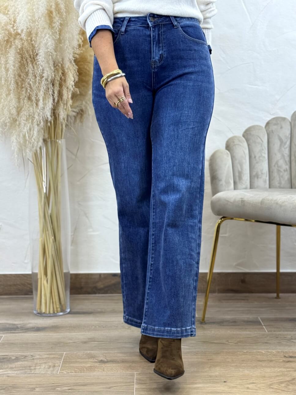 Pantalón tejido Denim elástico de corte recto, con cierre de botón y cremallera y bolsillos laterales y traseros.
