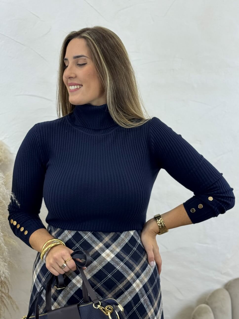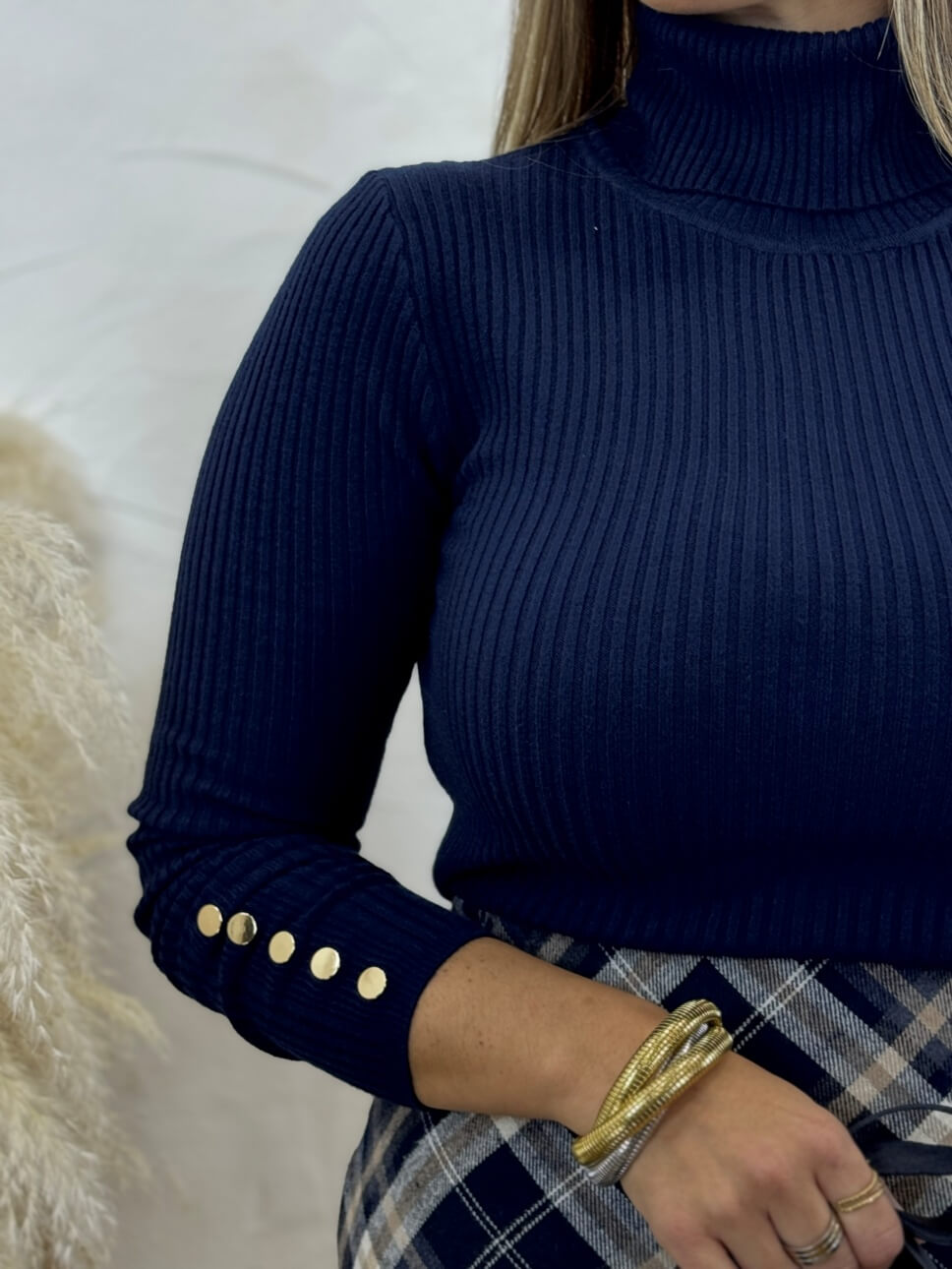 Jersey básico de canalé con botones decorativos en las mangas y cuello vuelto.