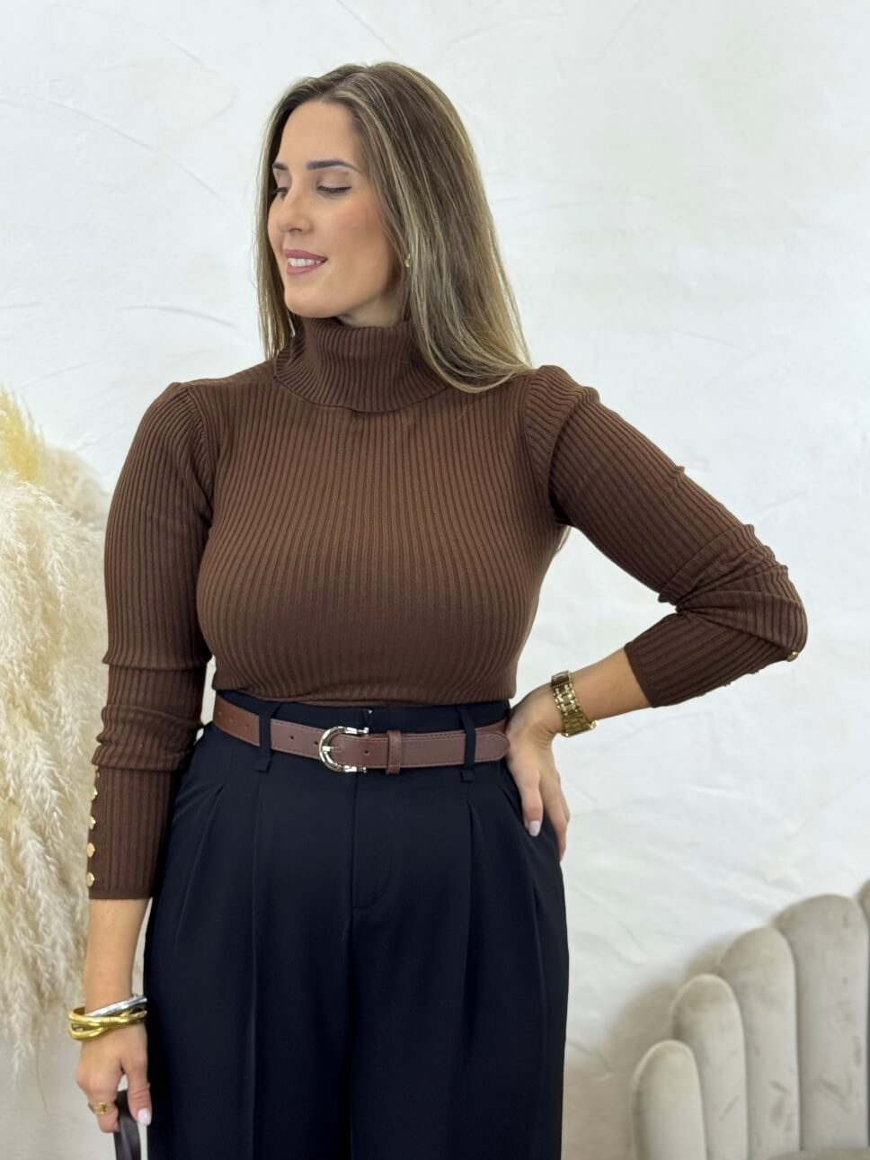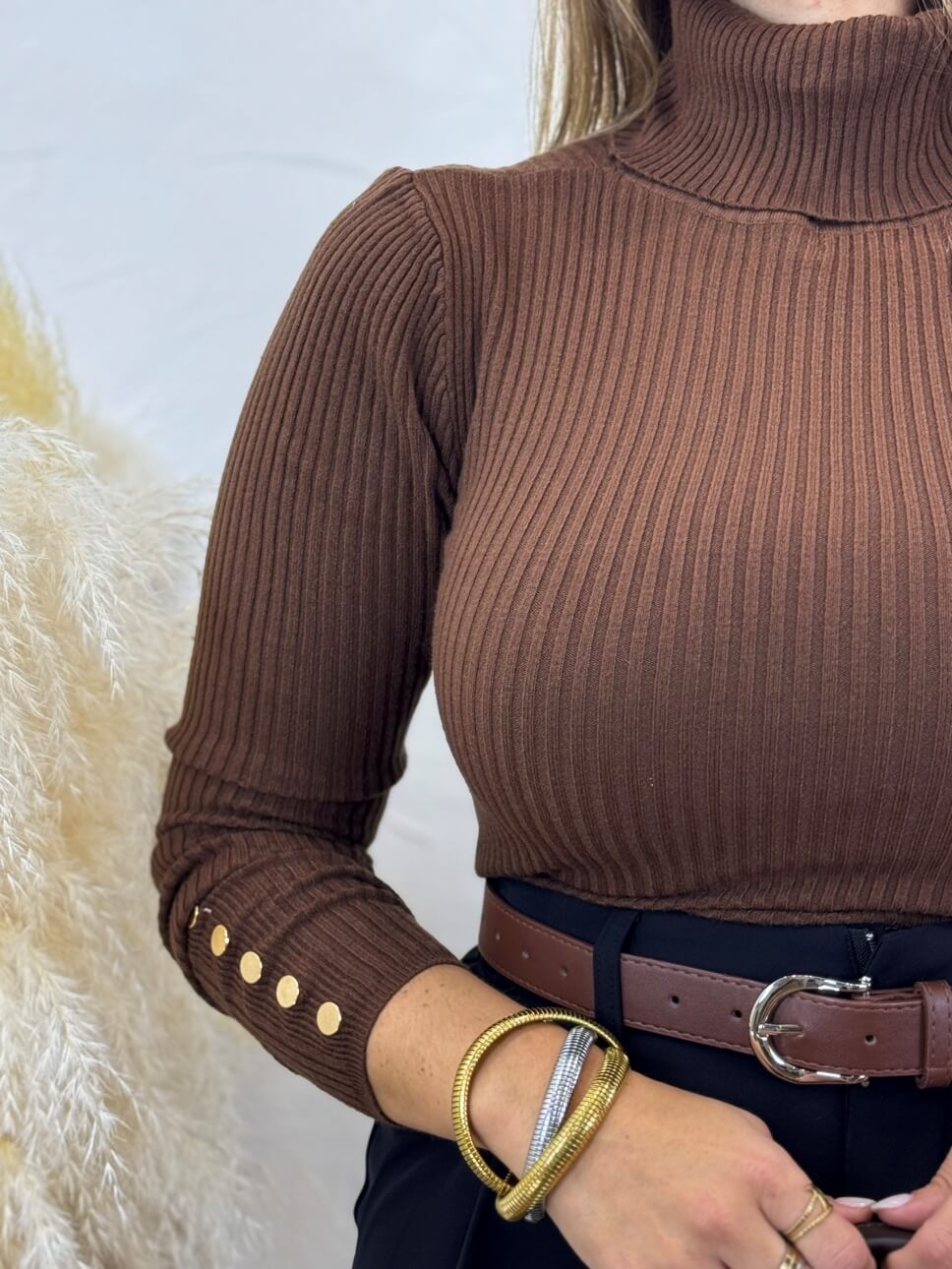 Jersey básico de canalé con botones decorativos en las mangas y cuello vuelto.