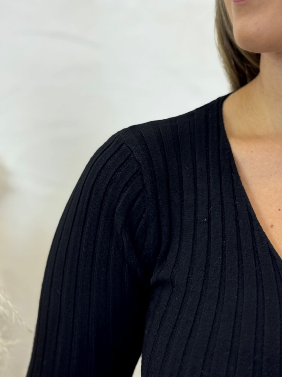 Jersey finito de canalé con cuello pico y manga larga.
