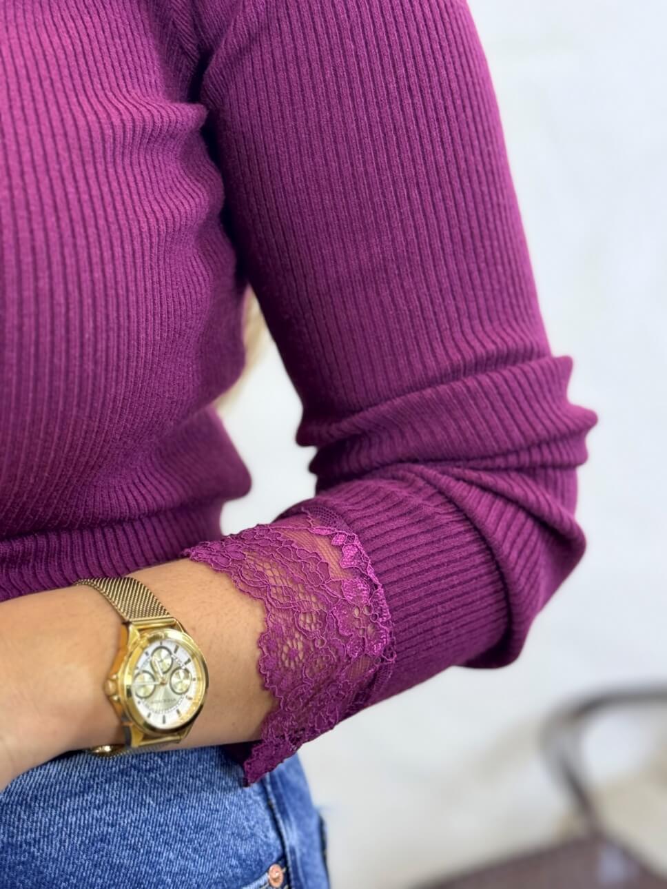 Jersey de canalé cuello de pico con detalles de puntillas en el cuello y en los puños.