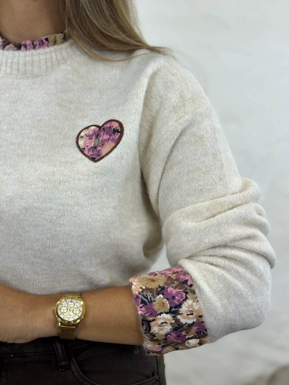 Jersey efecto lana con cuello plisado estampado y en tejido de panilla. Mismo tejido en puños y en corazón bordado.