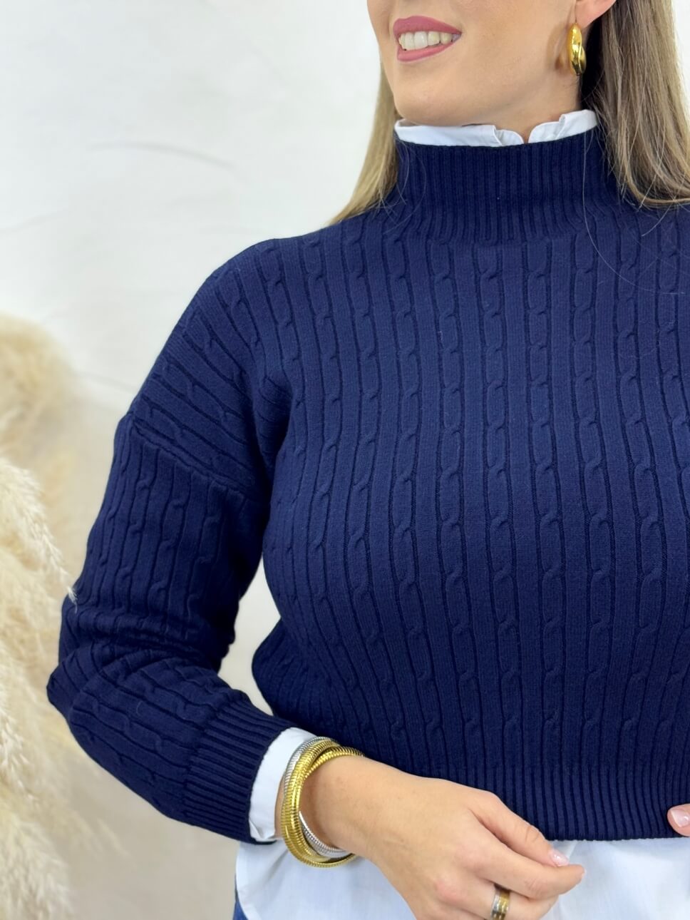 Jersey con forma de espiga, cuello medio de canalé, puños y cintura de canalé.