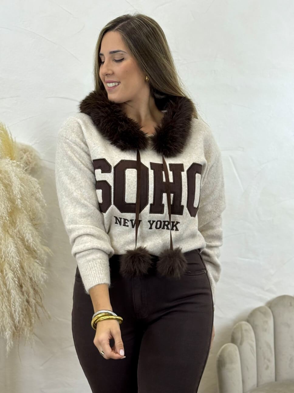 Jersey con capucha de pelo desmontable con botones. Pompones unidos al pelo de la capucha. Bordado de letras en la parte delantera.