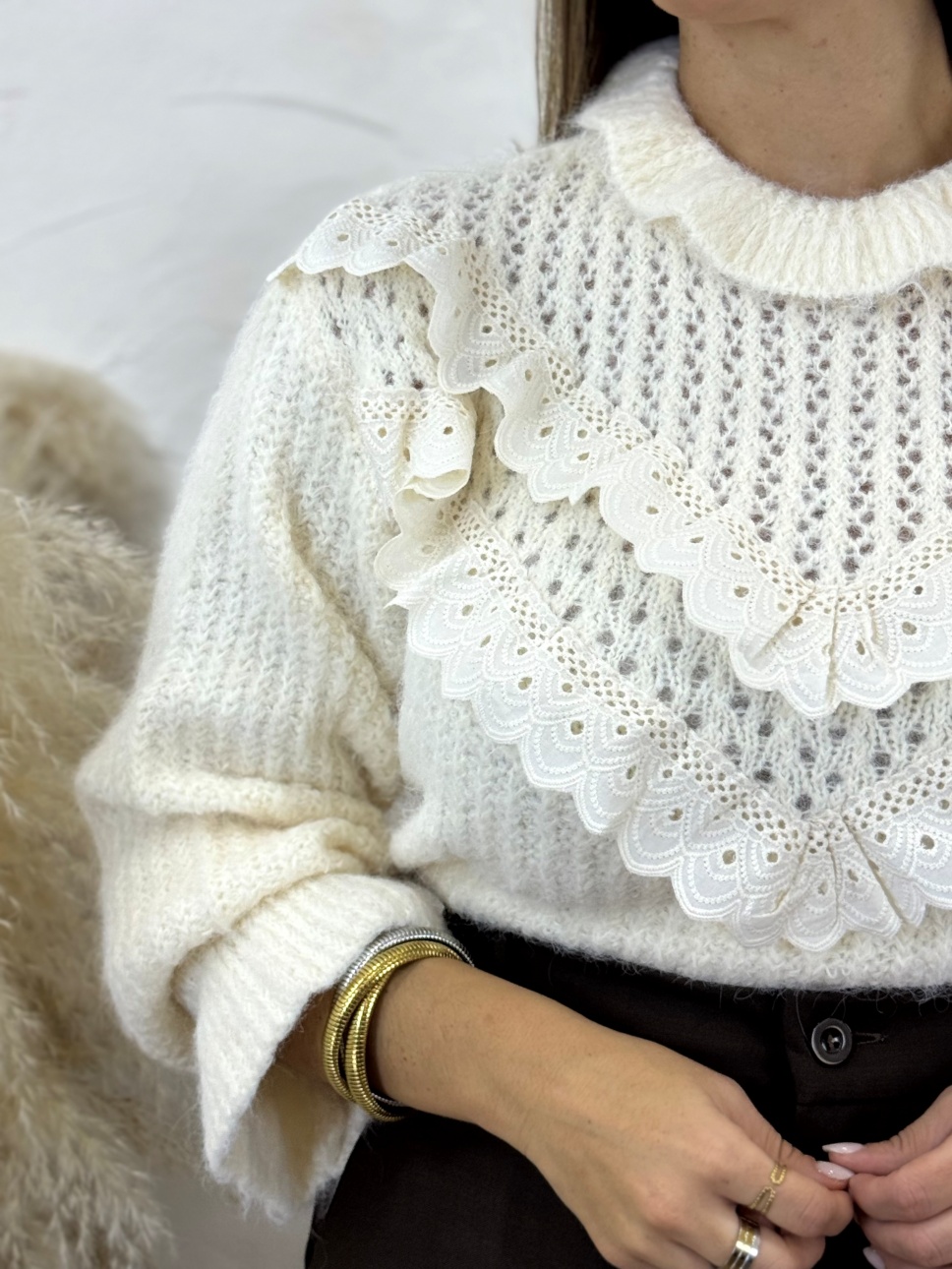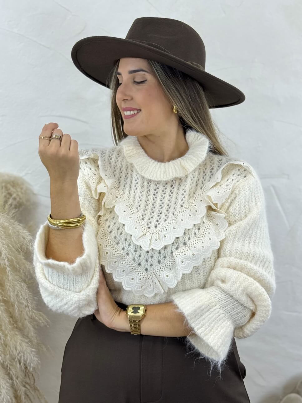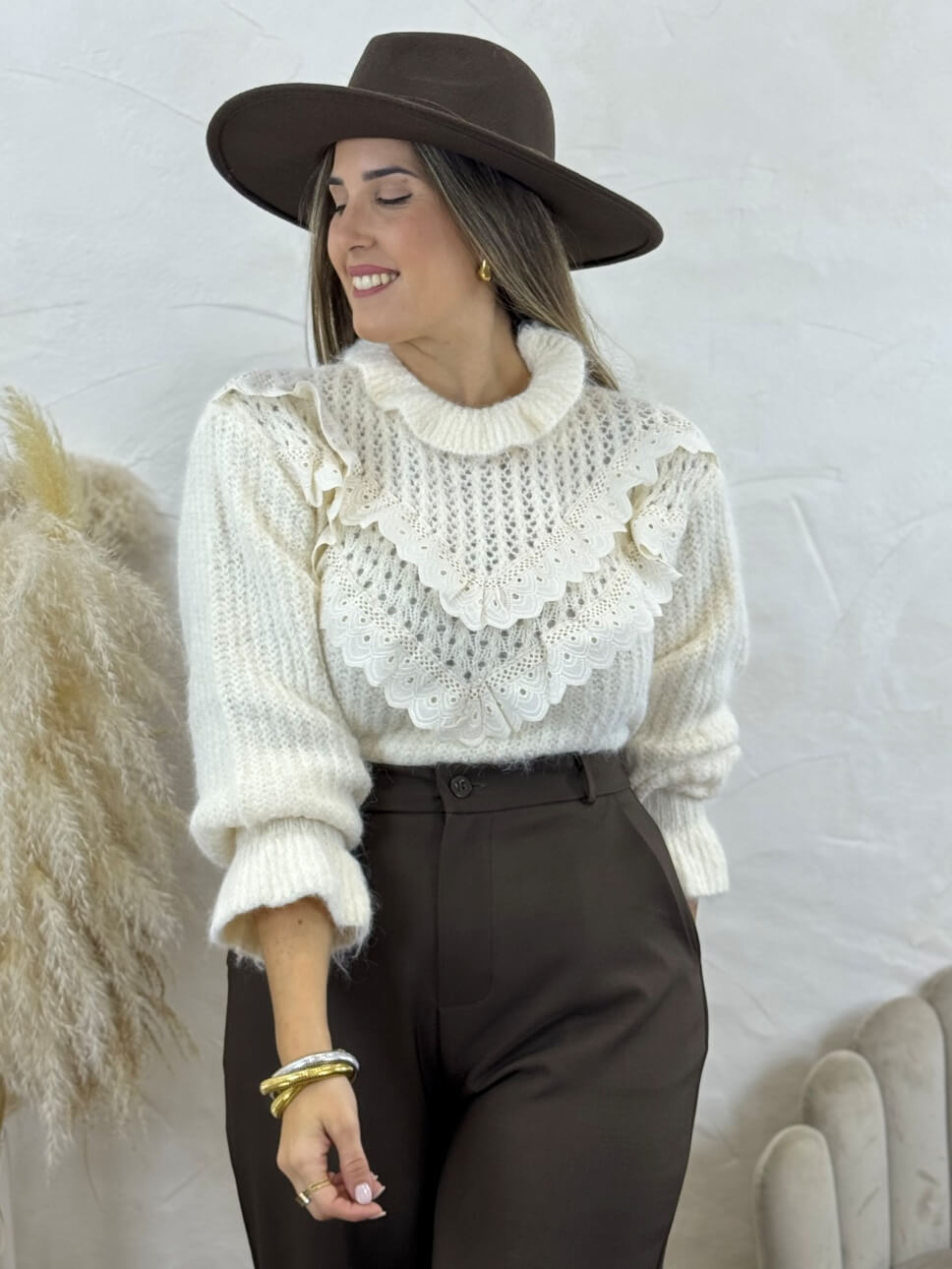 Jersey de lana con volantes de tela batista perforado en forma de V en la parte delantera, volantes en los puños y cuello mao con volante.